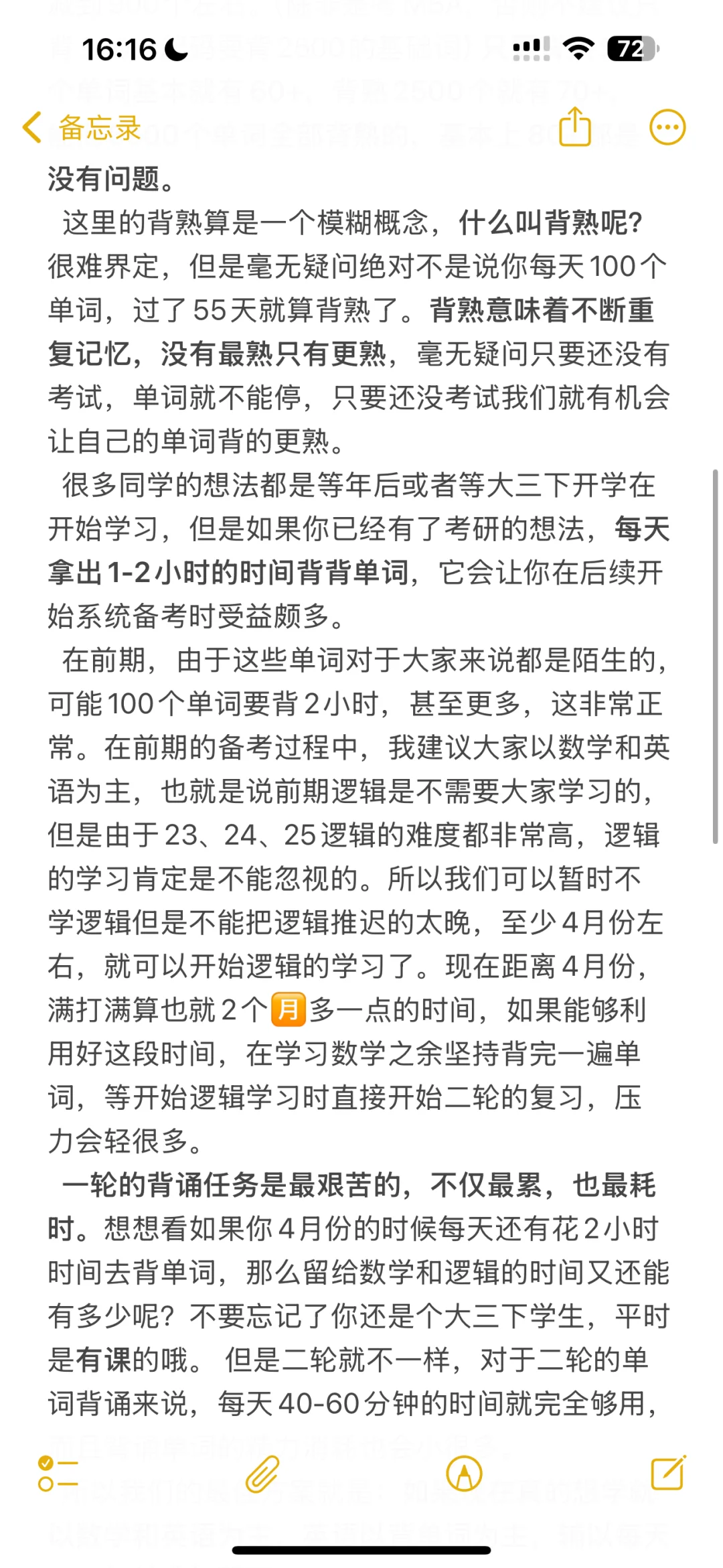 如果想学建议大家现在可以开始背单词,从现在开始到考研结束的那天一天都不要停(是的你没听错,背单词这事我希望你过年期间也坚持,因为它需要持续练习,不然忘的很快) 前期可以每天背诵50个词左右,习惯背诵方法和节奏后每天尽量背诵100个左右的单词。