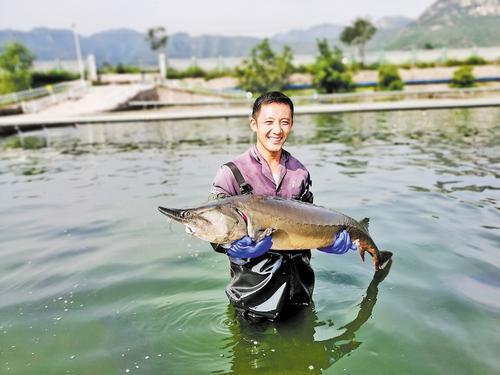 涉县常乐村村民展示养殖的鲟鱼。