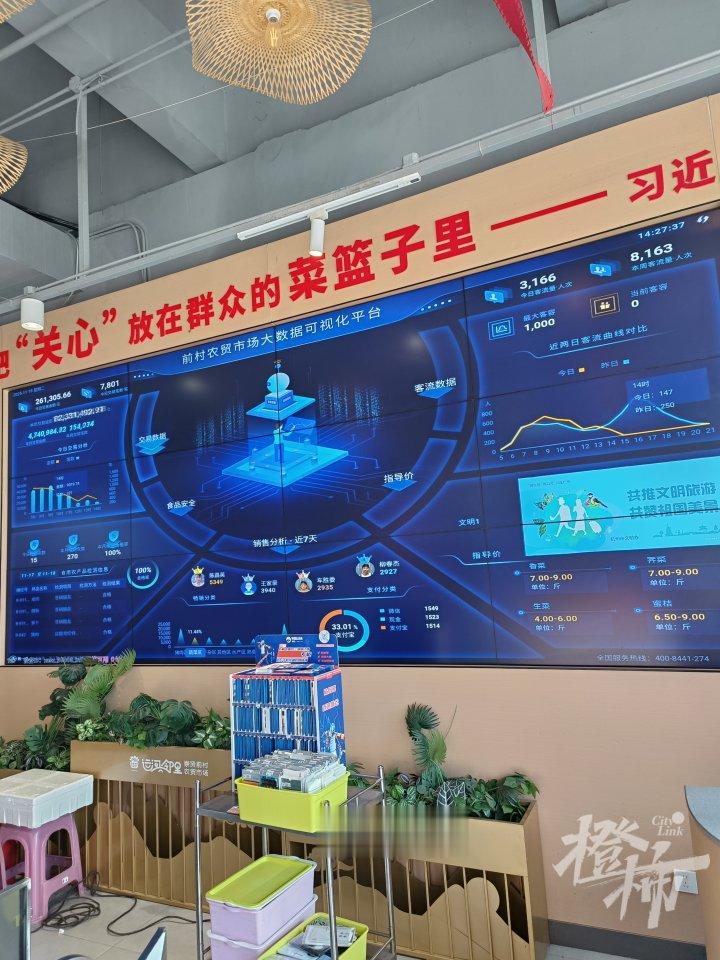 “前村农贸市场”位于崇超路与众望街路口东北侧,进门右侧是一块硕大的“前村农贸市场大数据可视化平台”电子屏,非常显眼,实时更新菜场当日销售额、交易笔数、客流量等信息。