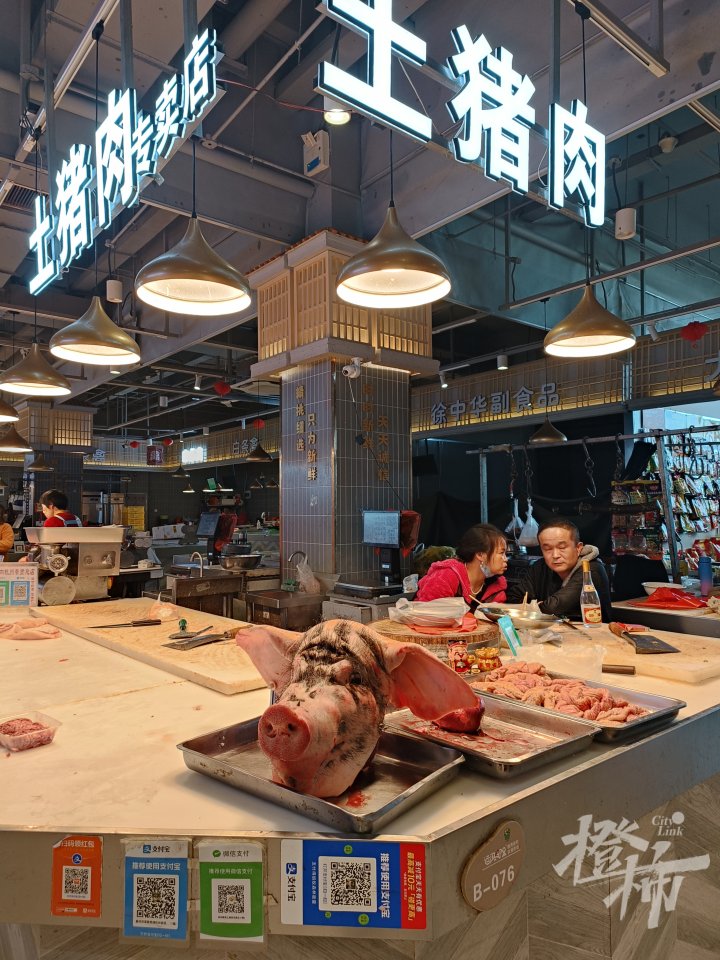 安徽阜阳的胡师傅夫妻俩在二楼卖土猪肉,下午3点不到已销售一空,只剩一个猪头一点猪肠。胡师傅在前村做生意十年,每天凌晨1点去富阳挑选毛猪,一般挑两头500斤上下的,一头白毛猪一头黑毛猪,凌晨5点半把猪肉拉到摊位,下午2点左右就能卖光,然后回家休息。“一是土猪肉口味好,顾客喜欢,二是薄利多销卖得便宜,同样的猪肉我朋友在别的菜场卖28元一斤,我这里才卖16元一斤,一天营业额大概一万多。现在的市场环境好,冬暖夏凉,客流量也很不错。”