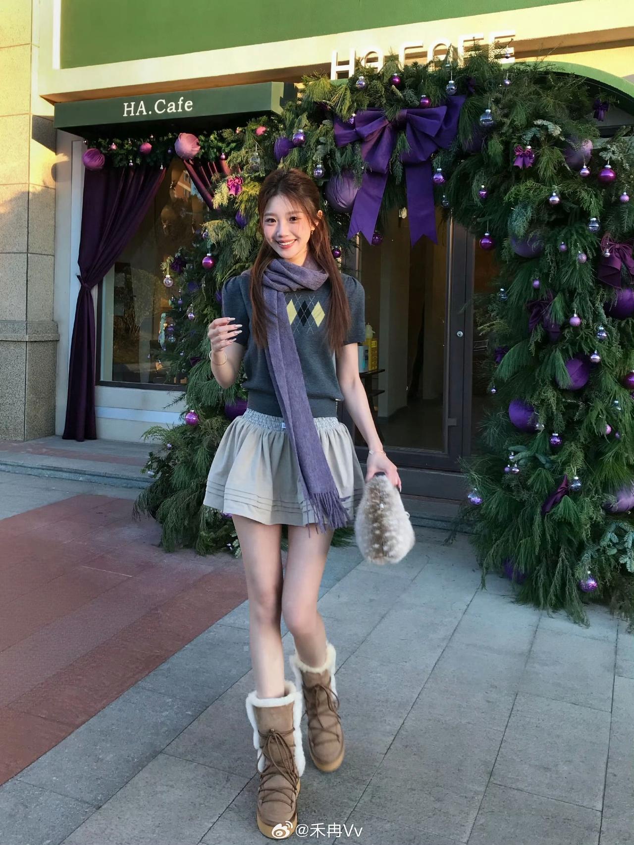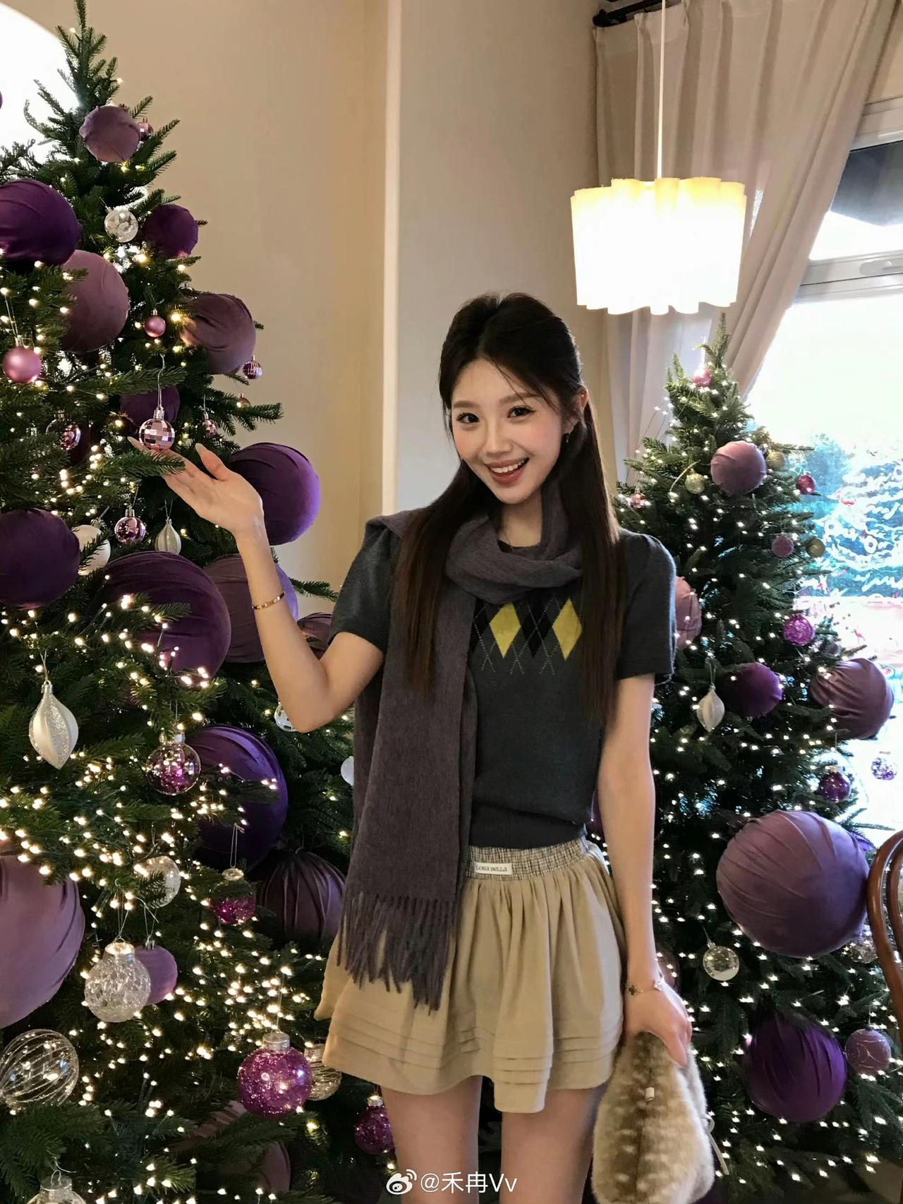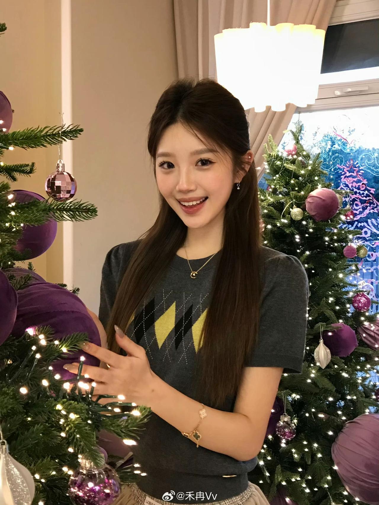 冬日暖阳下,圣诞树旁,甜美女孩与奶茶相伴,幸福满满!🎄🍓🍵