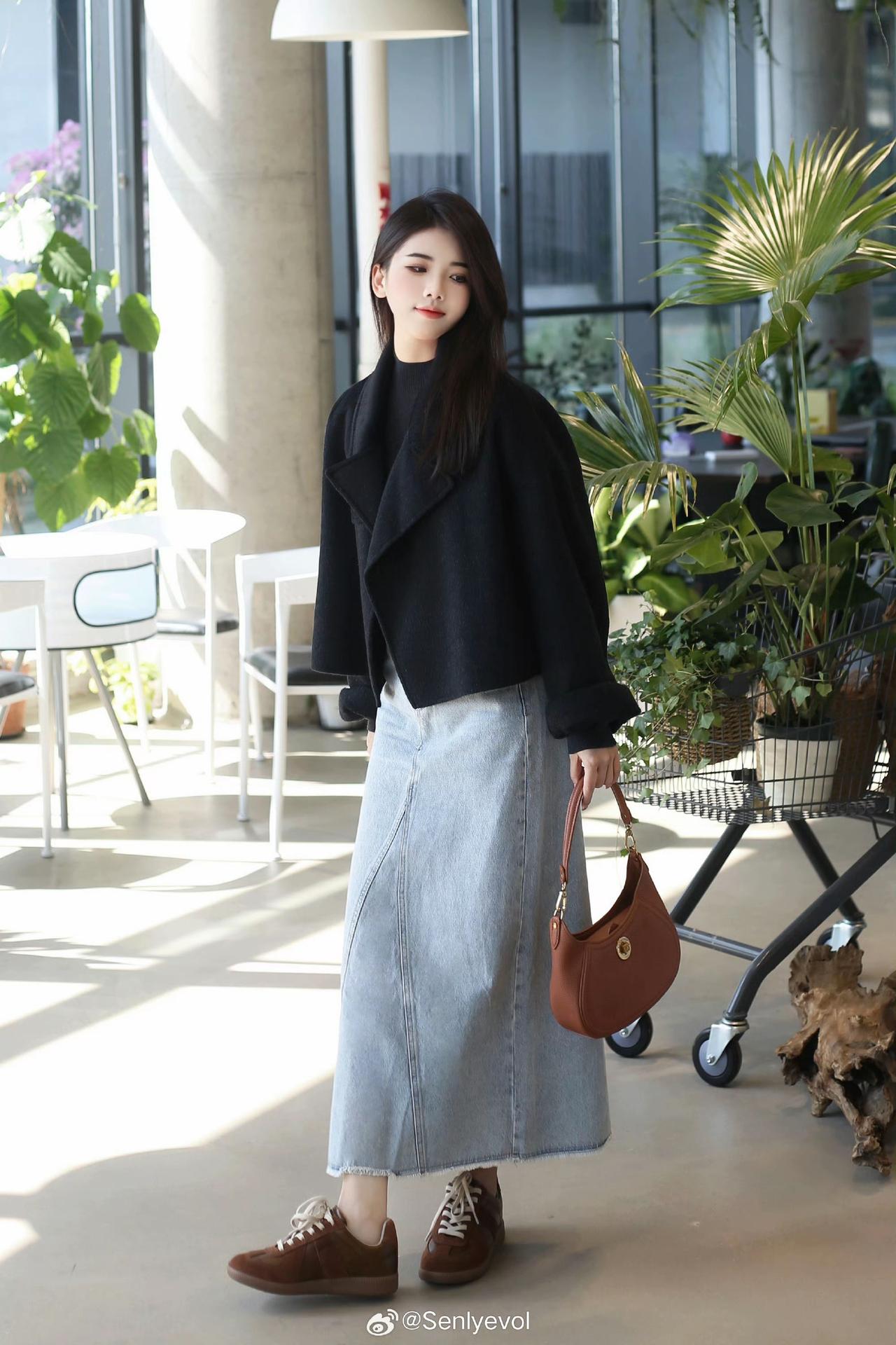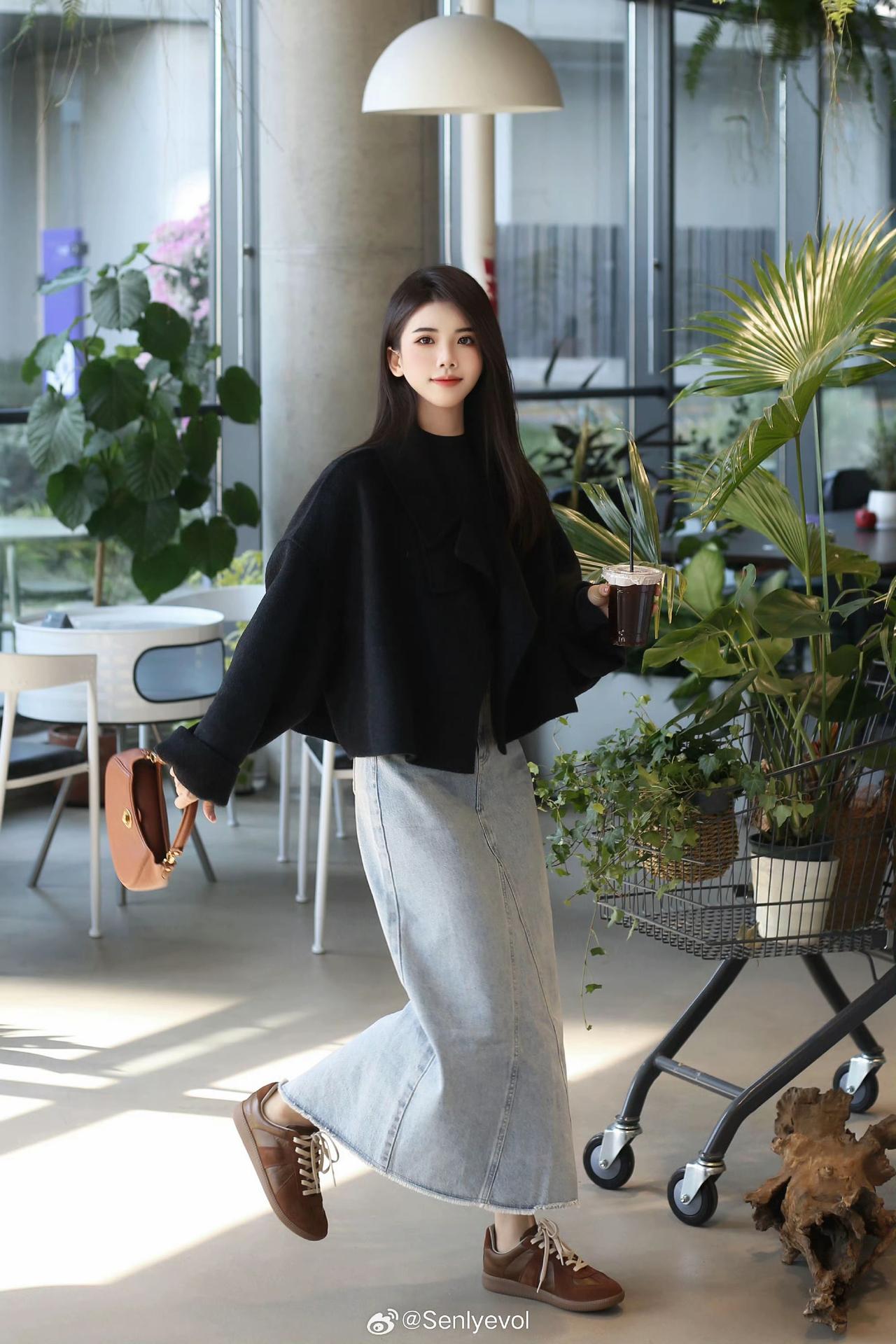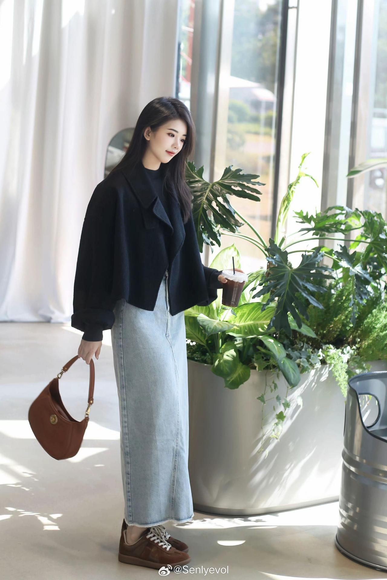 这身黑套装太好看了!短款上衣+短裙刚好显腿长,光腿神器配厚底长靴