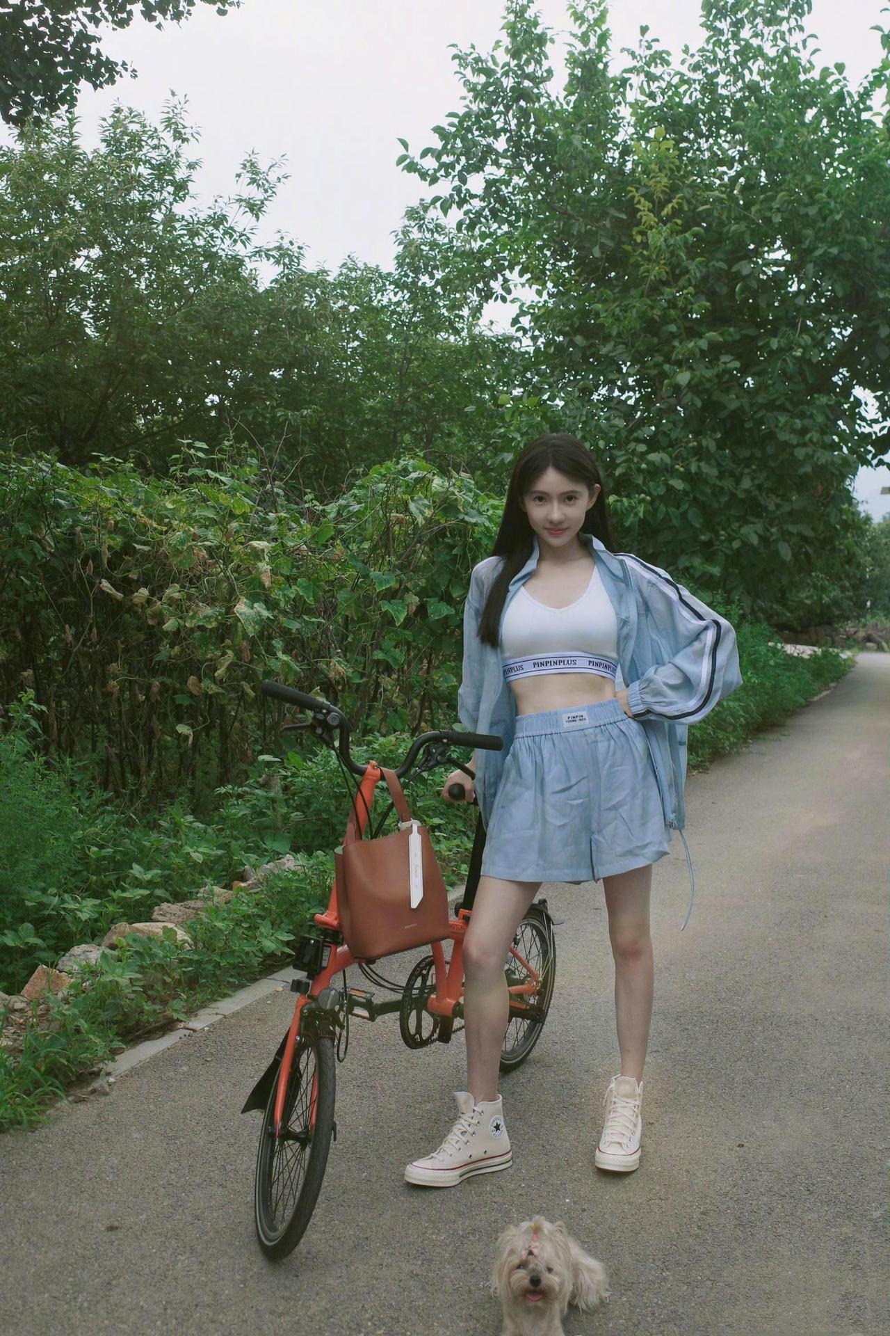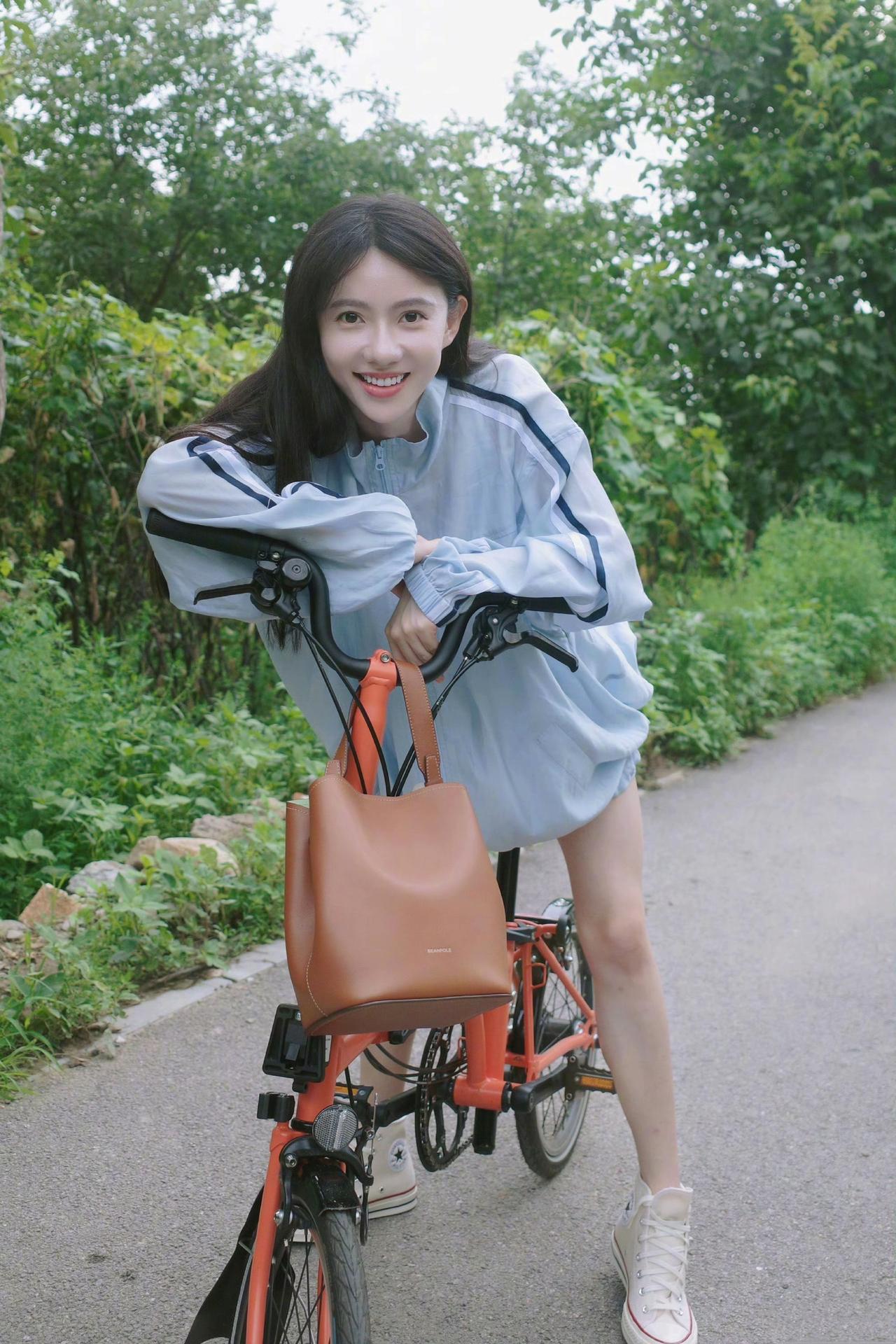 绿树阴中骑车行,春日微风拂面生。