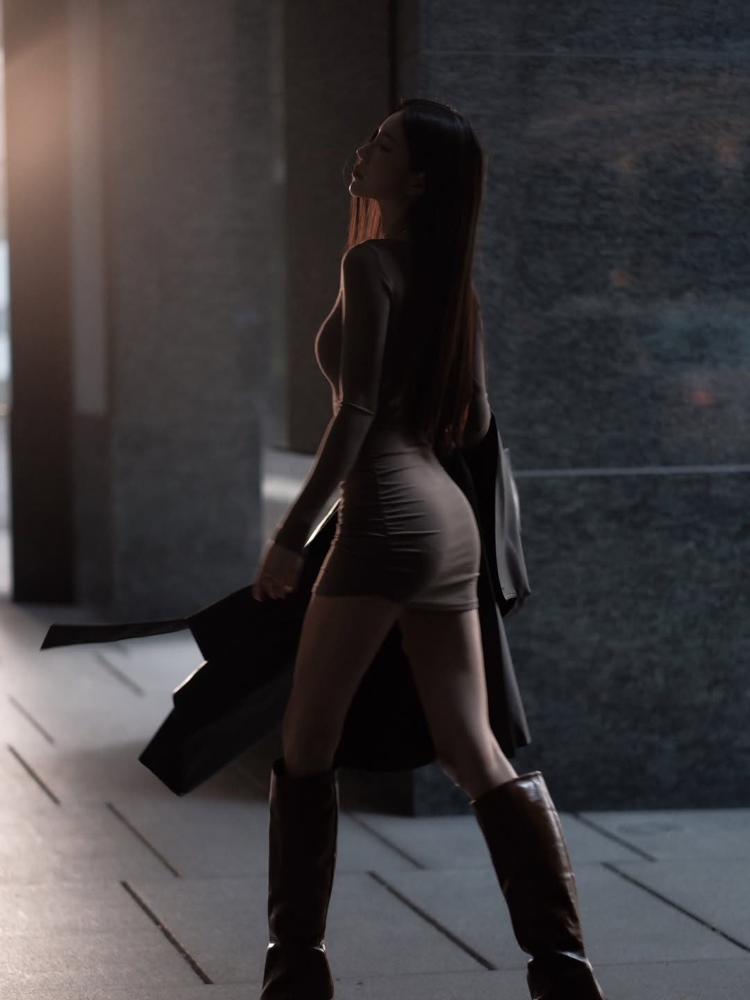 都市街头,时尚女郎,黑白酷炫,高跟靴子,自信步伐。