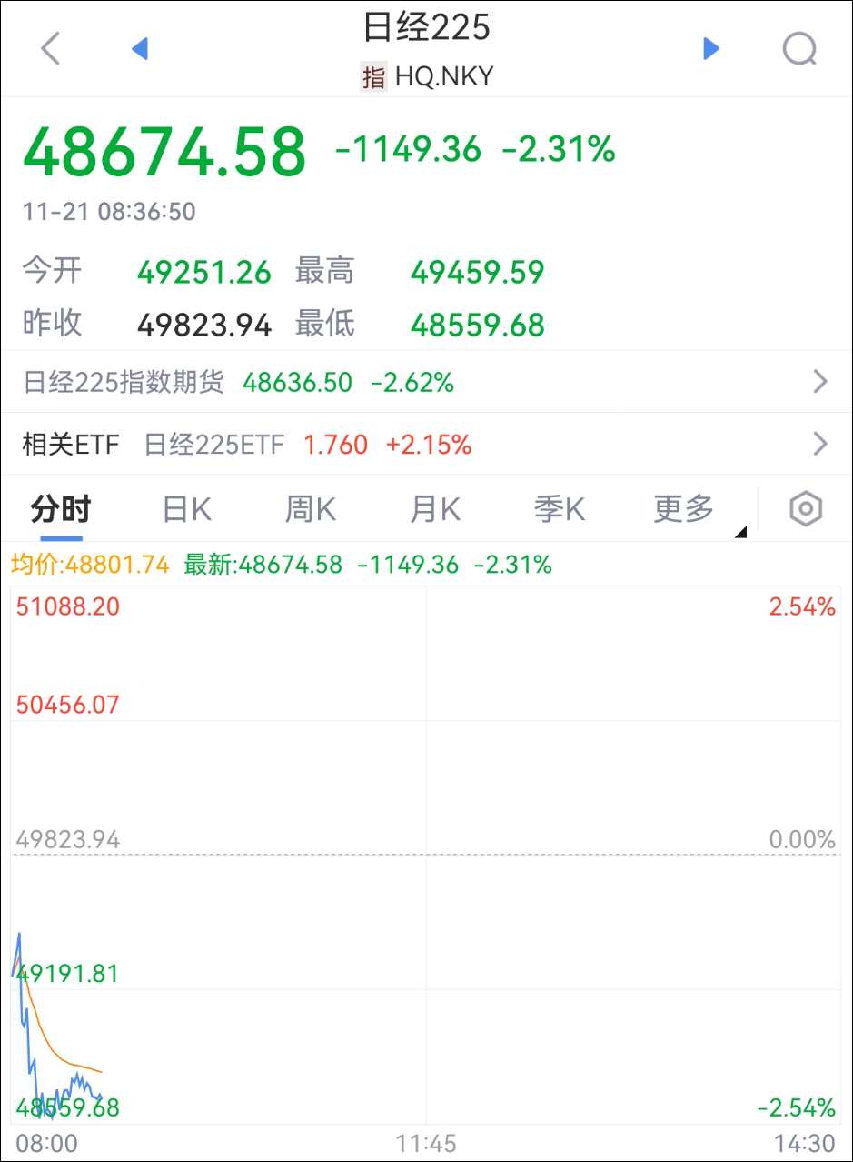 日经225指数盘初跌超2.5%,最低报48559.68点,较昨日收盘跌超1200点。