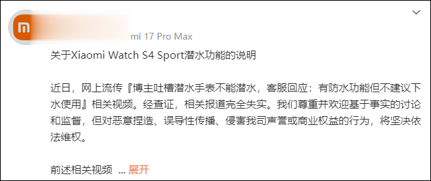 前述媒体提及的案例中,用户持XiaomiWatchS4Sport,经售后检测认定符合质保条件,与用户确认后为其更换前壳显示模组和防水胶圈,产品已恢复“潜水功能”。