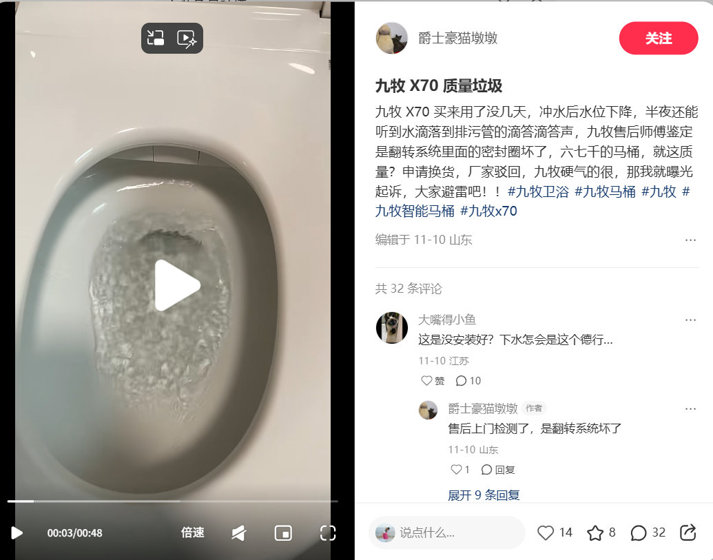 近日,一则关于九牧智能马桶质量问题的消费者发帖引发关注。该消费者称,花费六七千元购买的九牧智能马桶X70,在使用没几天后就出现异响、密封圈损坏等质量问题,申请换货时竟被厂家驳回。