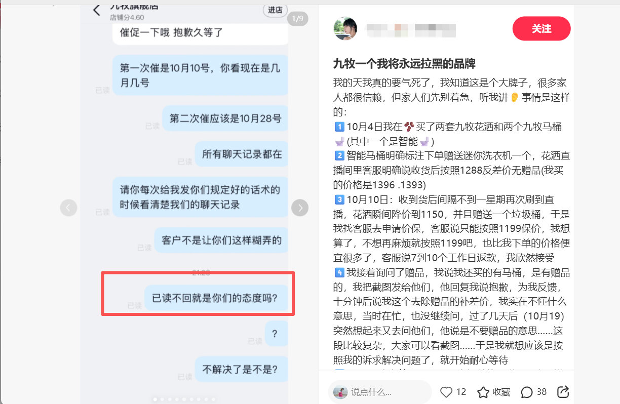 在质疑产品质量的同时,消费者对九牧的售后服务更为不满。多位用户反映遭遇“客服冷暴力,已读不回”、“永远不正面回复”等情况,显示出九牧在售后服务环节存在明显短板。