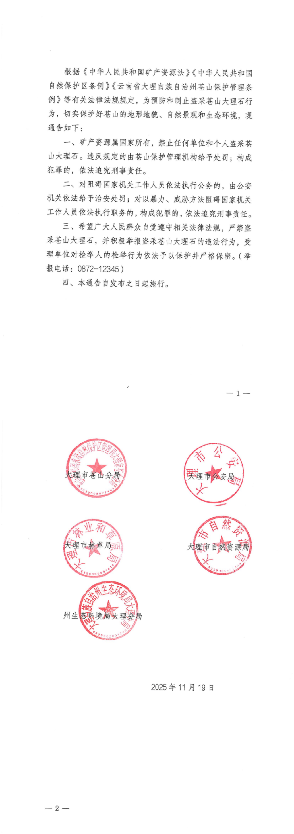 三、希望广大人民群众自觉遵守相关法律法规,严禁盗采苍山大理石,并积极举报盗采苍山大理石的违法行为,受理单位对检举人的检举行为依法予以保护并严格保密。