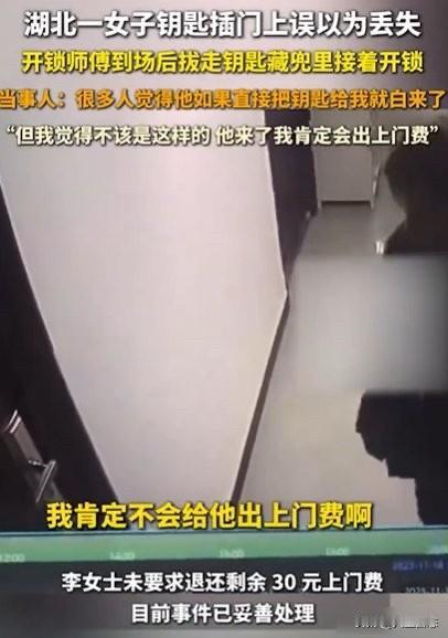 钥匙还在锁上,师傅却收钱开锁,这事儿真让人无语 李女士回家时,发现钥匙不见了,她马上用手机下单叫来开锁师傅,师傅来了之后没说什么话,直接开始动手开锁,其实钥匙一直插在门锁上,他趁着别人不注意把钥匙拔下来塞进自己口袋,装作很费劲地开了锁,最后收了八十块钱就走了。 李女士进了屋子,翻找柜子和抽屉寻找钥匙,但怎么都找不到,她突然想起门口装了监控,就调出录像查看,清楚地看到师傅把钥匙拿走的整个过程,于是她马上打电话联系对方,将截图发过去,要求退还五十块钱并归还钥匙,师傅没有多说什么,第二天就安排跑腿送回了钥匙,还转账退了五十块。 这事说起来不大,但仔细一想让人心里发毛,这个维修师傅以前也干过类似的事,他觉得大老远跑一趟只收五十块上门费划不来,就顺手搞了点小动作,多加了三十块开锁费,他赌的就是顾客不会查监控、也不会认真追究,结果被李女士当场发现。 更吓人的是,网上有些同行觉得这个做法没什么问题,他们说客户要是知道钥匙就在锁上,根本不会叫人过来开锁,这话听起来有点歪理,可还是有人相信,这种想法传开了以后,整个行业的风气就变歪了,大家想想,谁还敢随便请人上门来开锁呢。 我也见过别的师傅,他们看到钥匙插在锁上,就会主动说一句“您钥匙在这儿呢,我帮您拔下来”,客人一听就觉得这人靠得住,常常愿意多给些钱,或者写个好评,这些师傅做事凭的是诚恳,不是算计,挣的也是回头客的钱,不会做那种一次性的黑心生意。 目前平台对这类事情没有太多办法,投诉后最多就是退款,没人管得特别严格,李女士没有报警,不是她不愿意,而是觉得过程太麻烦,涉及的金额不大,证据还得自己找,警方也不一定优先处理,但这种事情多了以后,迟早会引发更大问题,消费者心里感到失望,以后再找人上门服务,就得提前录视频或者请人看着,这样成本就高了。 在一些老旧小区里,监控设备不多,居住的老人也多,顺手牵羊的事情就容易发生,还有人会在群里分享经验,说别拔车钥匙,碰上客户自己忘了锁,就能白赚八十块钱,这种话传开以后,比一个人贪心更糟糕,它让那些不守规矩的人觉得,自己不算异类,反而是聪明人。 开锁流程 开锁工 开锁公司