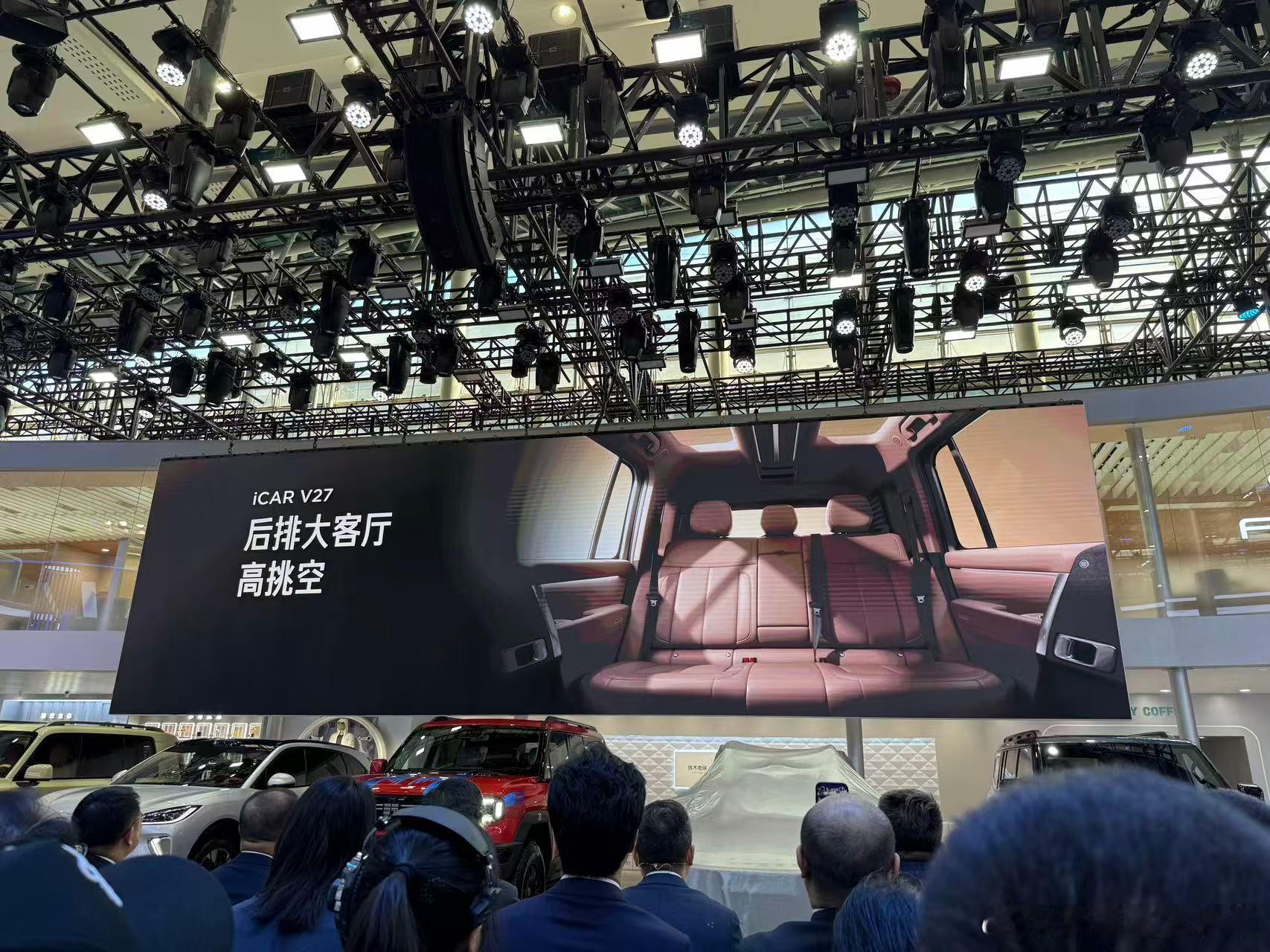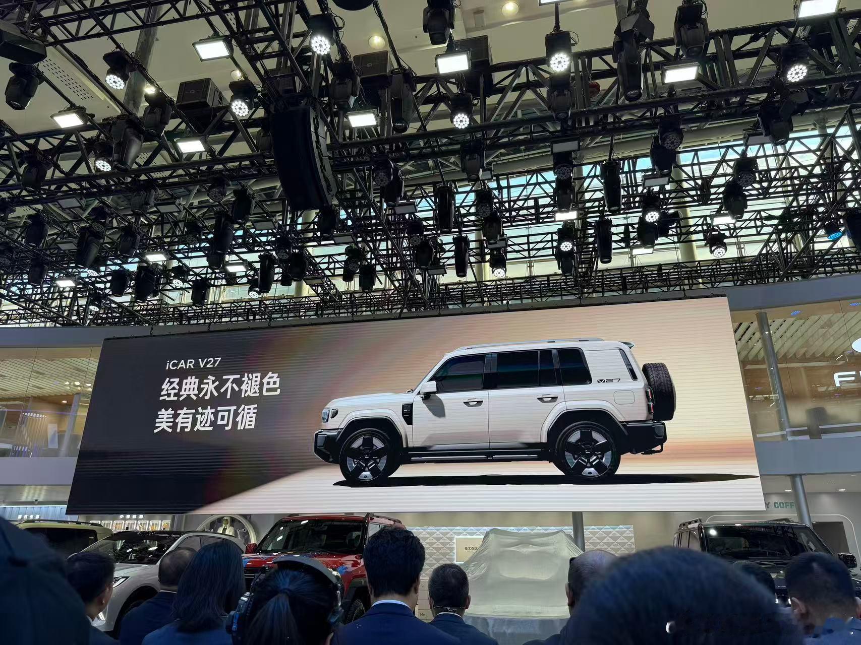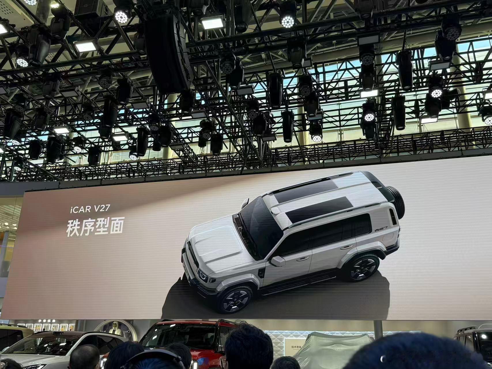 iCAR V27首发亮相。新车作为iCAR品牌首款增程动力中大型SUV,也是V系列旗舰车型,有望2026年一季度上市。新车外观采用全新设计语言,窄条幅式前格栅搭配方形灯腔与环形灯带,前包围银色护板野性足,还延续家族化设计元素。车身侧面方正魁梧、线条硬朗。内饰延续家族风格,有悬浮式中控屏、无线充电面板等。动力方面,采用1.5T发动机与电机组成的增程系统,发动机最大功率105kW,有后驱和四驱版本,四驱版最大功率有望达335kW,纯电续航200km,综合续航有望超1000公里,后续还将推出高配版本。