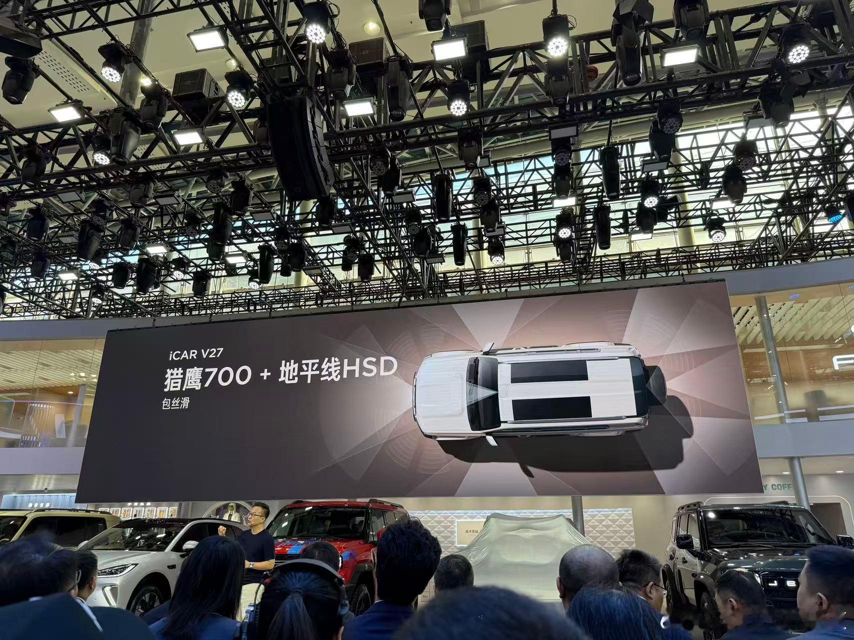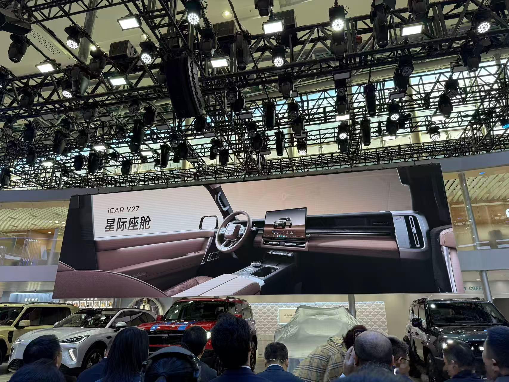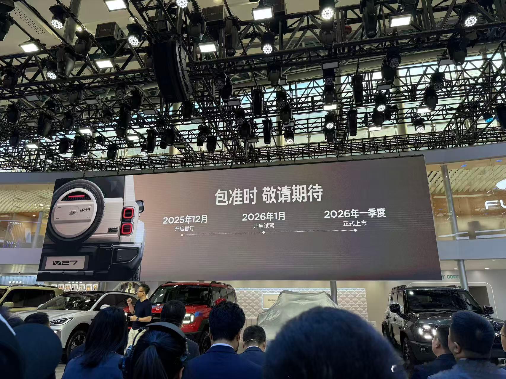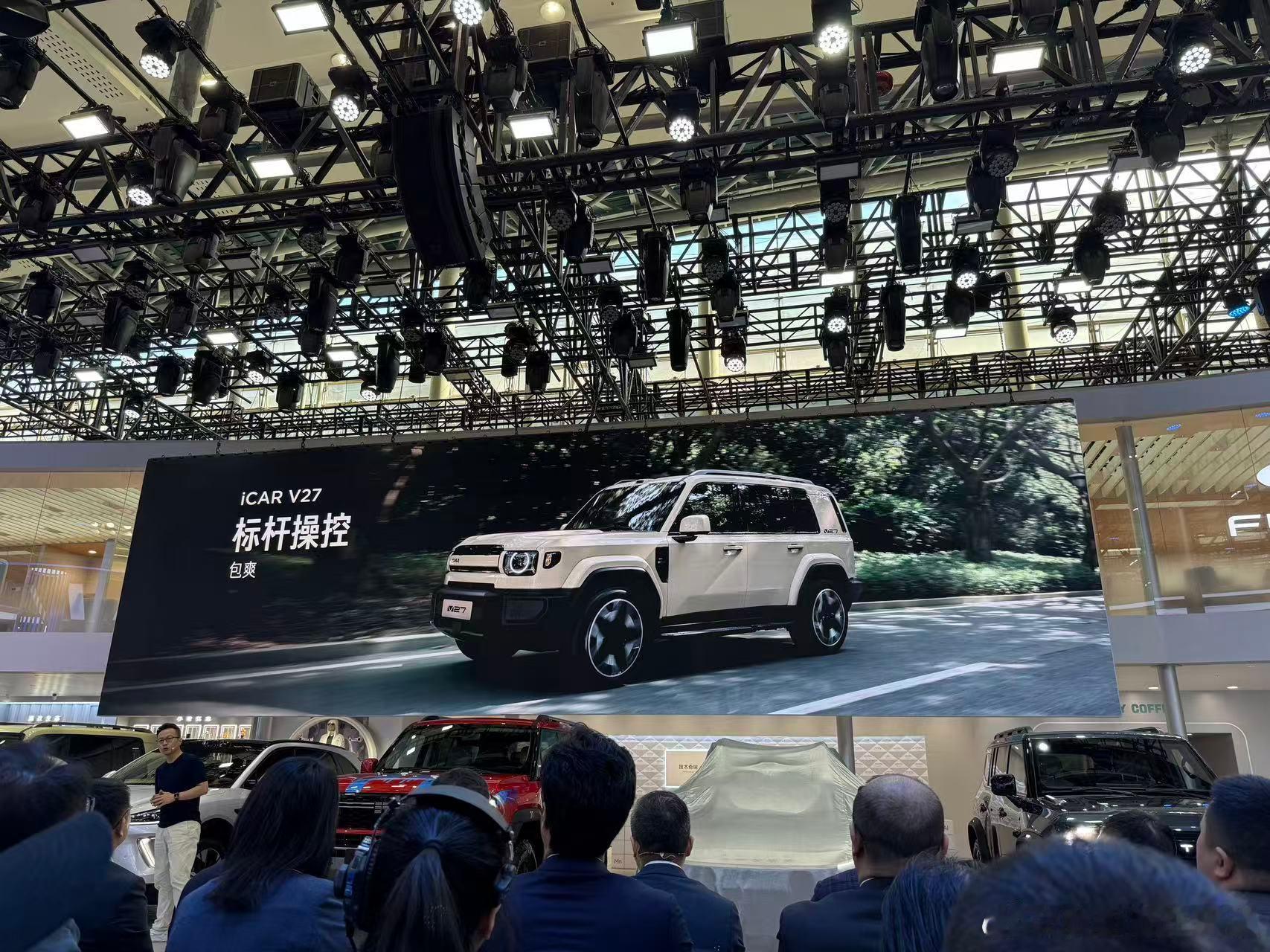 iCAR V27首发亮相。新车作为iCAR品牌首款增程动力中大型SUV,也是V系列旗舰车型,有望2026年一季度上市。新车外观采用全新设计语言,窄条幅式前格栅搭配方形灯腔与环形灯带,前包围银色护板野性足,还延续家族化设计元素。车身侧面方正魁梧、线条硬朗。内饰延续家族风格,有悬浮式中控屏、无线充电面板等。动力方面,采用1.5T发动机与电机组成的增程系统,发动机最大功率105kW,有后驱和四驱版本,四驱版最大功率有望达335kW,纯电续航200km,综合续航有望超1000公里,后续还将推出高配版本。