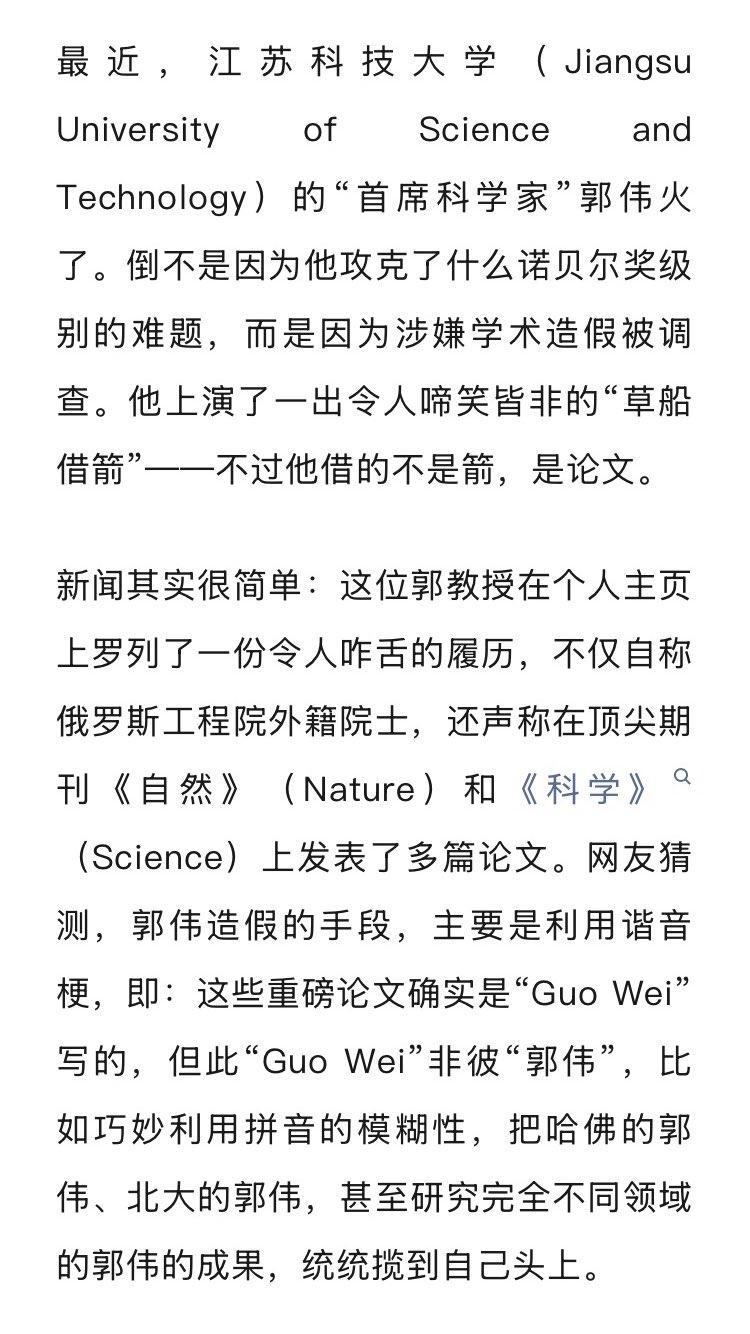 江苏科技大学首席科学家郭伟,原来是钻了这个空子:把跟自己名字拼音“Guo Wei”重名的论文揽到自己名下,再赌学校行政人员看不懂英文。 一个骗子就这样过关斩将成了首席科学家😯 上半年协和董小姐,下半年科学家郭伟,现实比小说还精彩啊😧