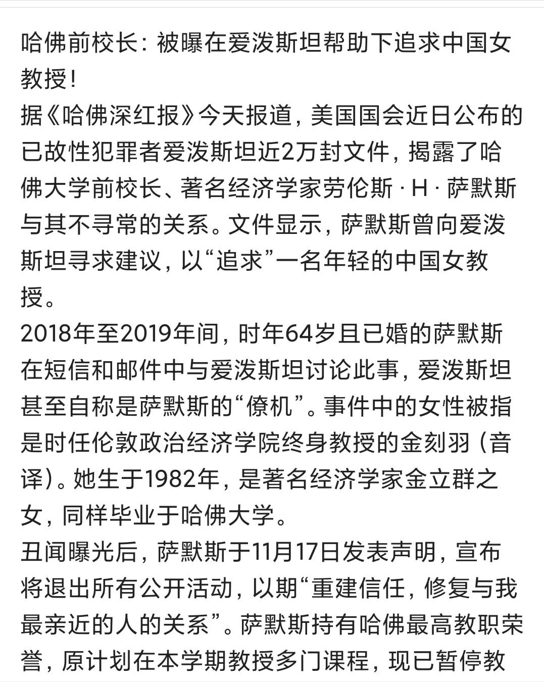 最近爱泼斯坦案又爆出新文件,让人意外的是,国内金融圈知名美女金刻羽也在名单里被提到了。文件里还有一句“in bed again”,意思挺微妙的,大家自己品。 这位女士的履历确实很亮眼: 14岁就从人大附中去美国留学; 26岁拿到哈佛金融博士; 29岁当上伦敦政经的教授; 30岁前发了两篇顶级论文; 客观的说,她确实是个学霸,但她在一些公开场合发表的观点也引起过不少争议。 现在这事一出,有人就想起董明珠说过“要慎用留学生”的话,觉得说得挺有道理。 很多网友也都在讨论:像这样有复杂海外背景的人,如果真到了重要岗位上,能不能守住立场? 这倒不是说所有留学生都不可靠,但关键岗位选人,必须把忠诚和国家安全放在第一位,这确实得慎重再慎重。