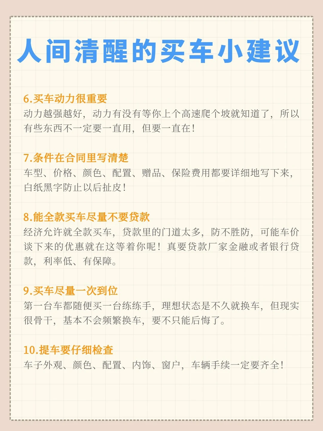 1⃣️买车尽量一次到位,第1台车都随便买一台练练手,理想状态是不久就换车,但现实很骨干,基本不会频繁换车,要不只能后悔了。