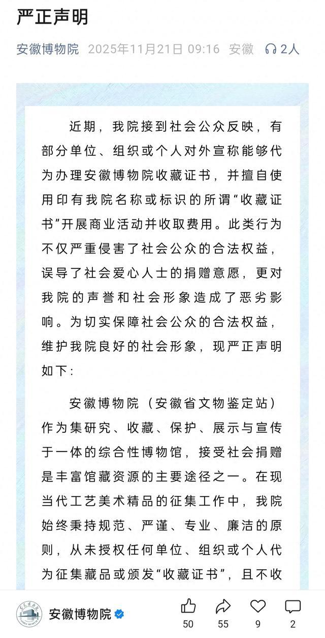 大皖新闻讯收藏能代办收藏证书?要提高警惕。文物爱好者、喜欢收藏的藏友注意了,小心不要被骗了。11月21日上午9时16分,安徽博物院(安徽省文物鉴定站)发布一则严正声明,引发关注。