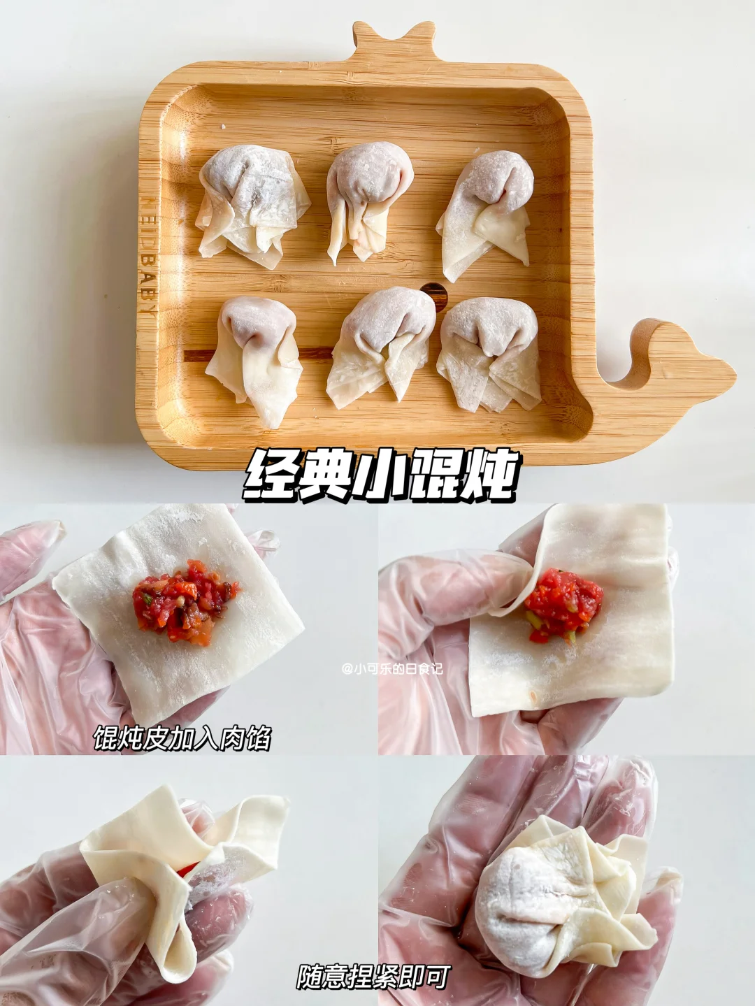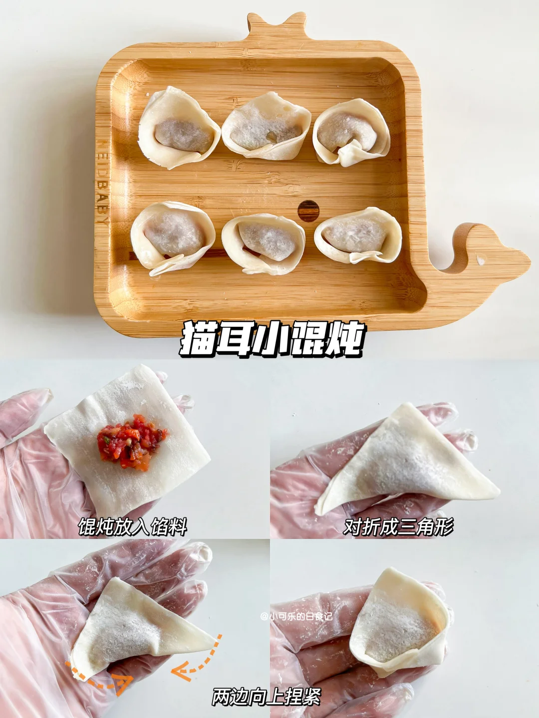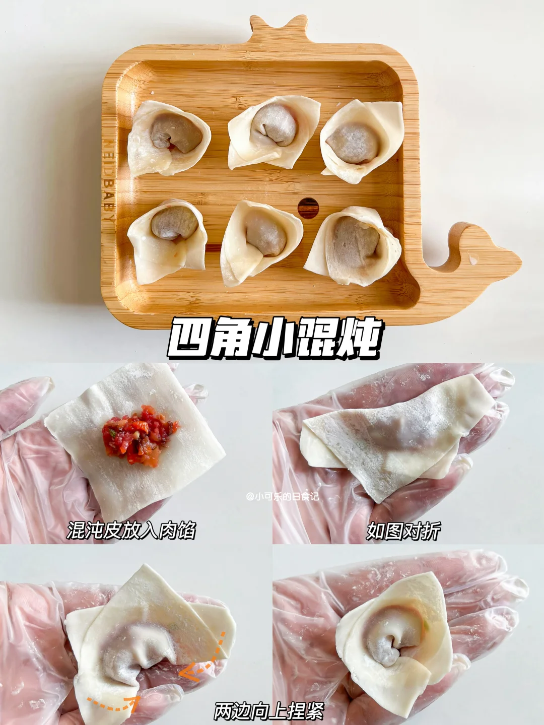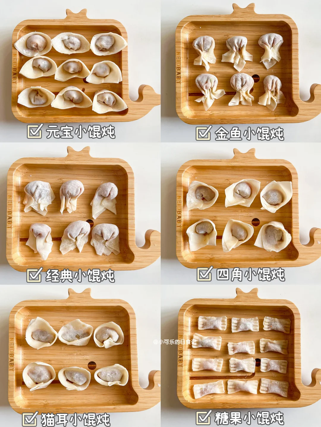 我家宝宝超爱吃馄饨,每次煮一大碗连汤都喝光光,一有时间我都会多包一些馄饨冷冻起来,吃的时候方便又营养,5分钟就可以搞定宝宝营养餐。 [偷笑R]今天来分享六款不同馄饨的包法 ✅元宝小馄饨 ✅金鱼小馄饨 ✅经典小馄饨 ✅四角小馄饨 ✅猫耳小馄饨 ✅糖果小馄饨 • 🔎详细包法 图3-9 今天做的是牛肉胡萝卜馅,这个搭配真的超香,馅嫩多汁,香迷糊啦 🥣食材: 牛肉、胡萝卜、香菇、芹菜 🌈做法: ①胡萝卜和香菇焯水,全部食材搅打碎 ②加入一个蛋黄,加宝宝盐和松茸粉调味 ③顺时针拌均匀上劲