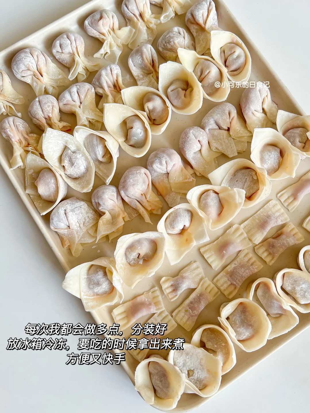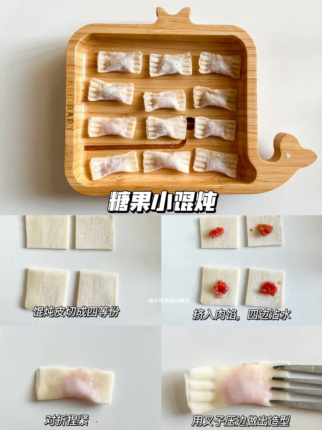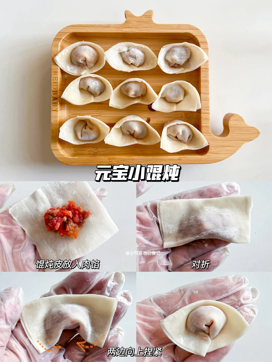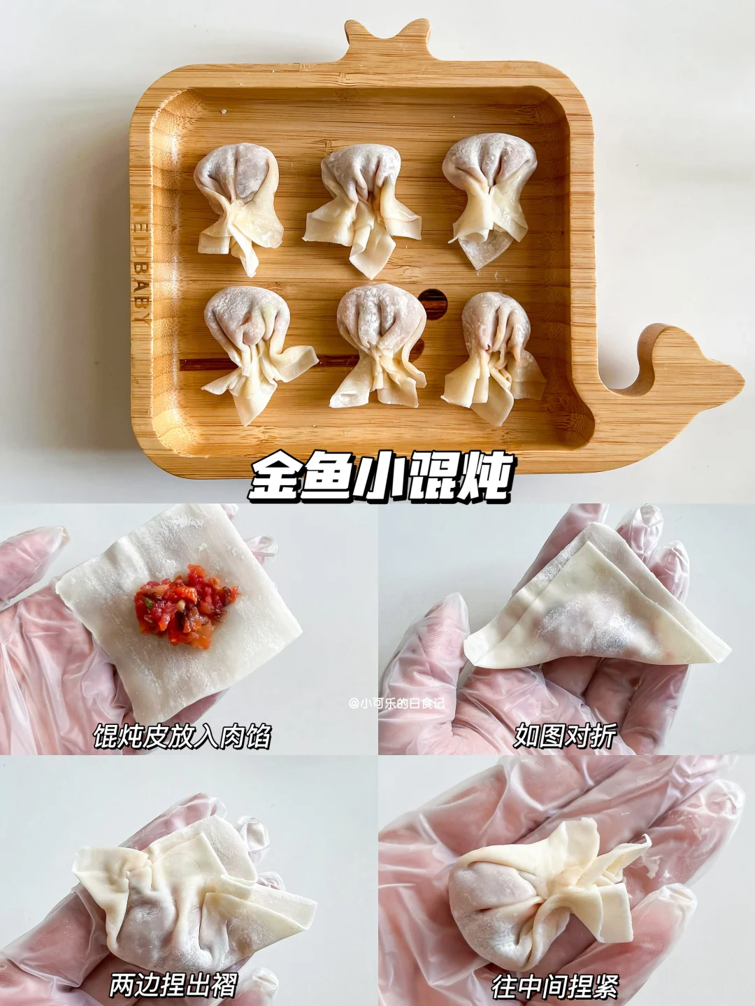 我家宝宝超爱吃馄饨,每次煮一大碗连汤都喝光光,一有时间我都会多包一些馄饨冷冻起来,吃的时候方便又营养,5分钟就可以搞定宝宝营养餐。 [偷笑R]今天来分享六款不同馄饨的包法 ✅元宝小馄饨 ✅金鱼小馄饨 ✅经典小馄饨 ✅四角小馄饨 ✅猫耳小馄饨 ✅糖果小馄饨 • 🔎详细包法 图3-9 今天做的是牛肉胡萝卜馅,这个搭配真的超香,馅嫩多汁,香迷糊啦 🥣食材: 牛肉、胡萝卜、香菇、芹菜 🌈做法: ①胡萝卜和香菇焯水,全部食材搅打碎 ②加入一个蛋黄,加宝宝盐和松茸粉调味 ③顺时针拌均匀上劲