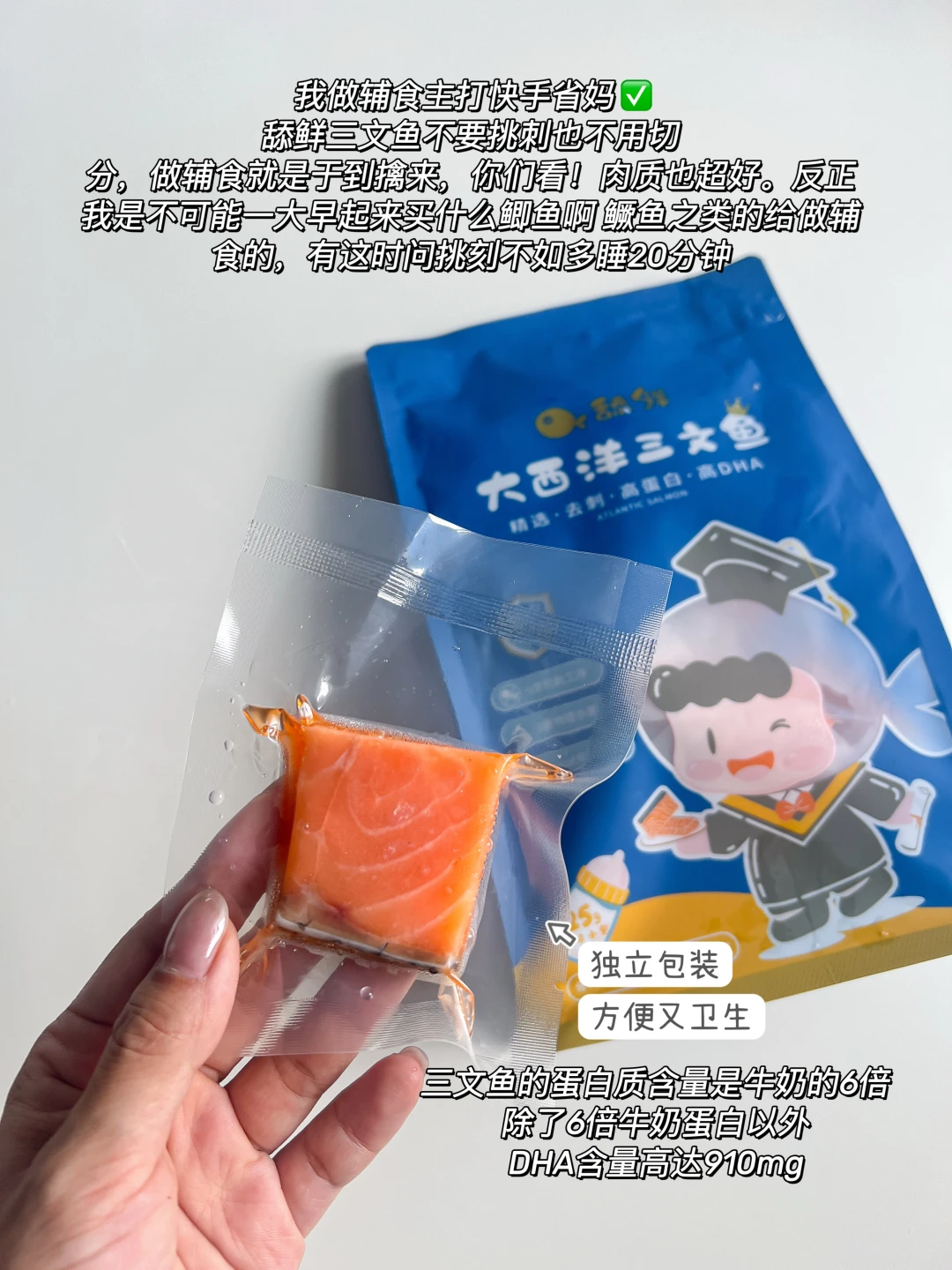✅舔鲜三文鱼的DHA含量高达910mg,比市售的普通三文鱼高出3倍,鳕鱼的2倍,相当于6个鸡蛋,我家里经常会囤货。