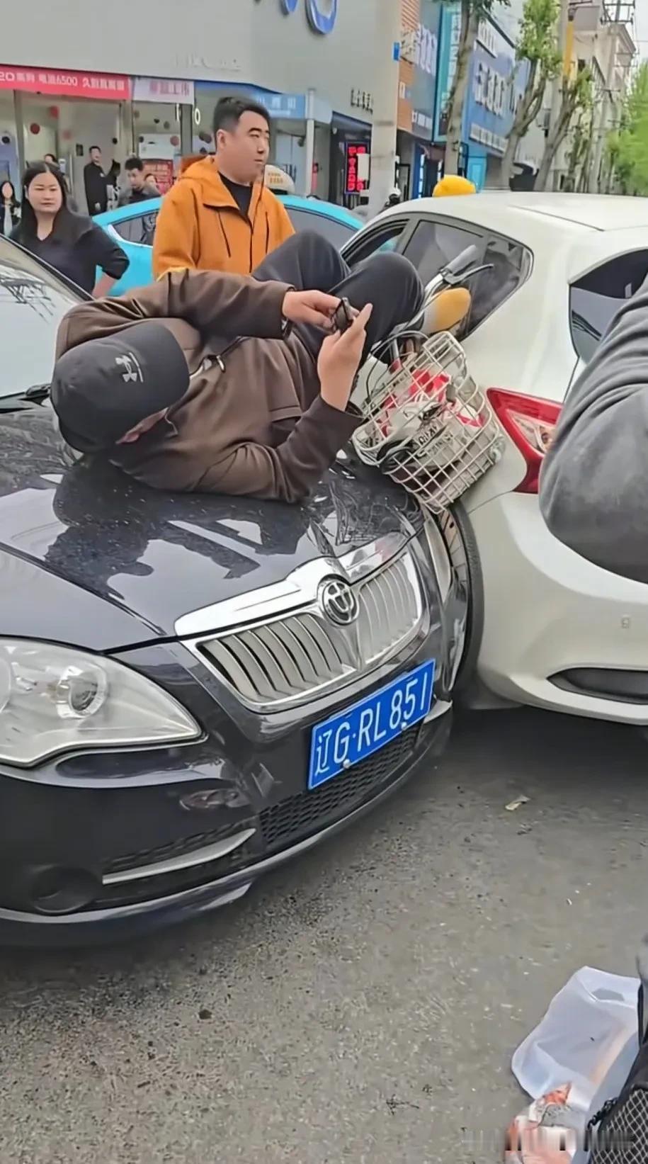 你大爷终究是你大爷。发生在北方某城市的这起交通事故,骑自行车的大爷被两辆私家车给夹了。从现场的照片来看,大爷应该也无大碍,还挺淡定的躺在车前盖上玩手机,静静的等待车主进行事后的处置。车主可能也挺无奈的吧。