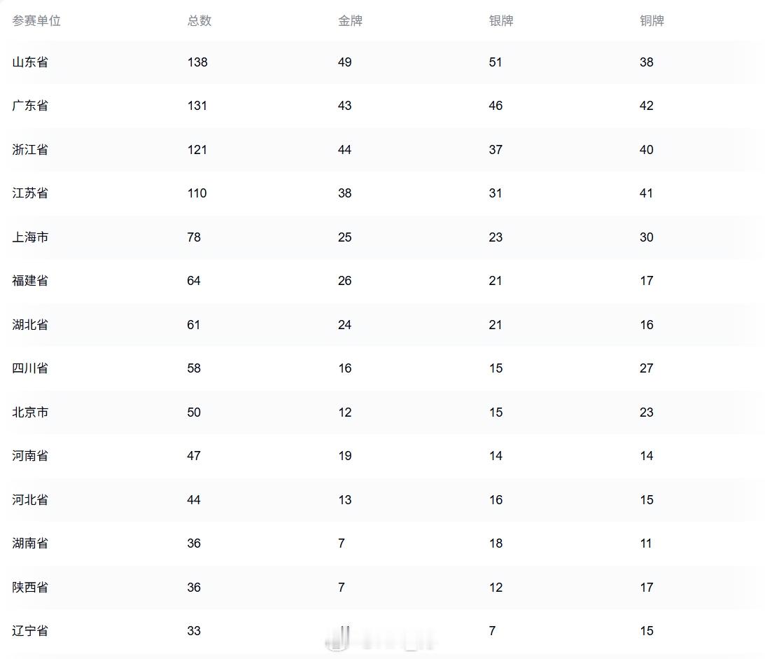 全运会奖牌榜,山东仍大幅度领先,广东超越已无望。浙江,江苏竞争激烈。山东以54