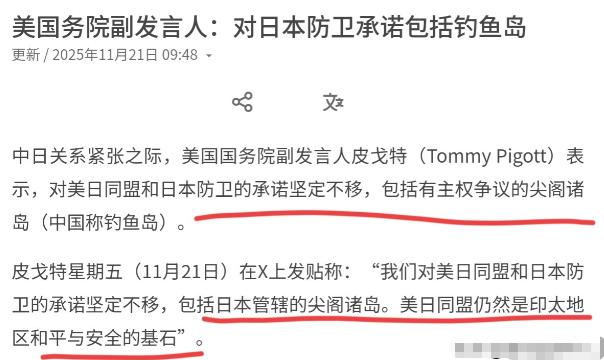 美国首次出来回应了!对于中日博弈,11月21日,美国务院副发言人皮戈特表示,对美日同盟和日本防卫的承诺坚定不移,包括有主权争议的钓鱼岛。我们坚决反对任何单方面改变台湾海峡、东海或南海现状的企图,包括使用武力或胁迫手段。 这是美国在高市早苗公开挑衅后首次表态,等于直接站到日本一边,把话点到了中国的核心利益上。 几个月前,中美贸易战暂时休战,中方采购了美国的大豆,美国也拿到了急需的稀土资源,看似是互惠的交易,但在大国博弈里,很难有纯粹的商业往来,这些动作反而让美国感觉自己握有了一点底气,可以在政治和安全领域重新施压。 随后,高市早苗挑起话题,把敏感的台湾问题和东海局势搬到台面上。她的言论,不像是一时冲动,更像是测试中方反应的探针。 明年四月,特朗普计划访华,这段时间打“台湾牌”,无疑是在为谈判制造筹码,这也是美方一贯的做法——在正式会面前先制造紧张气氛,以求在谈判桌上占据主动。 皮戈特的这番声明,等于美国撕掉了之前的遮掩,从幕后协调走到了前台警告,直接将钓鱼岛纳入防卫范围,并点名台海、南海等区域,显然是在对中方释放强硬信号,这不是零散的外交表态,而是配合高市早苗的动作,形成了一套从试探到官方施压的策略链。 但这样做的风险不小。中方对这种挑衅并非毫无准备,如果美方坚持在台湾问题上制造事端,不排除再次收紧稀土出口或暂停已订的大豆订单,这不仅会打击美国的经济利益,还会让双方刚缓和的经贸关系迅速降温。 更重要的是,如果中美关系在特朗普访华前急剧恶化,这次访问可能直接取消,这样一来,美国原本想通过外交斩获的成果就会落空。 而一旦双边关系再度进入对抗状态,必然会波及美国国内政治生态,给共和党的中期选举增加不确定甚至负面影响,经济压力、外交失败叠加,很可能变成共和党不可承受的政治包袱。 对于这种情况,中方一直都心里有数。核心利益问题没有退让空间,美国如果执意在敏感地带挑事,回应必然会是明确且有力的,贸易、资源、外交都可能成为反制手段。 美方这次的举动,折射出他们习惯在谈判前制造摩擦的老套路,但面对中国,这一套未必能得到想要的结果。 如果在中美之间不断制造新冲突,收获的只可能是更多的不确定,以及自己付出的代价。未来几个月,这盘棋的走向,将直接决定明年四月是否还有所谓的“高层互访”,也会影响东亚乃至全球的战略格局。 在你看来,美国这次的动作,是在试探,还是在提前加码?欢迎在评论区留下你的看法。