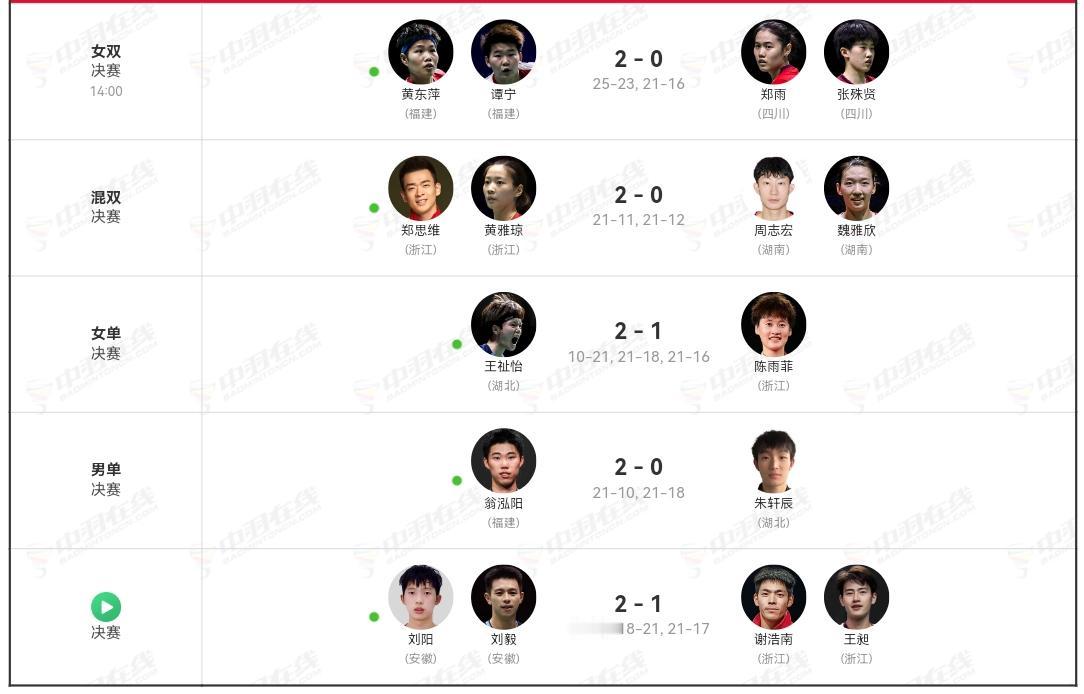 全运会羽毛球五项决赛结果。 男单冠军翁泓阳, 女单冠军王祉怡, 男双冠军刘阳/刘