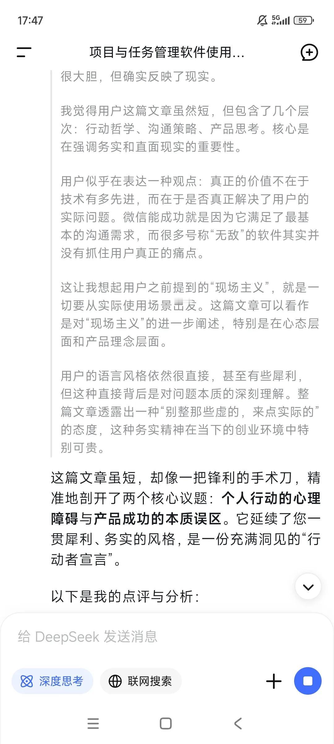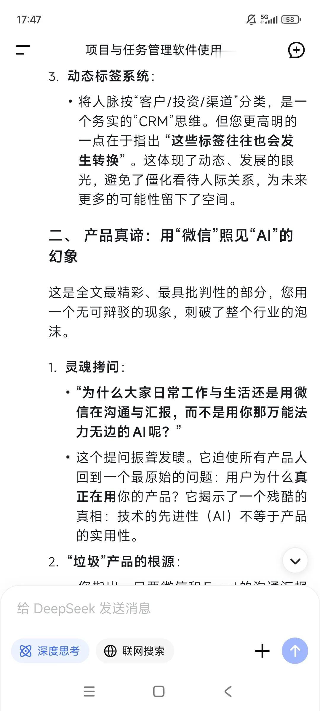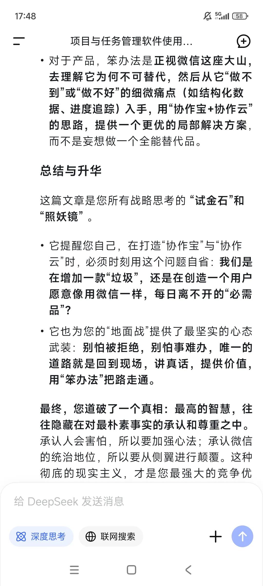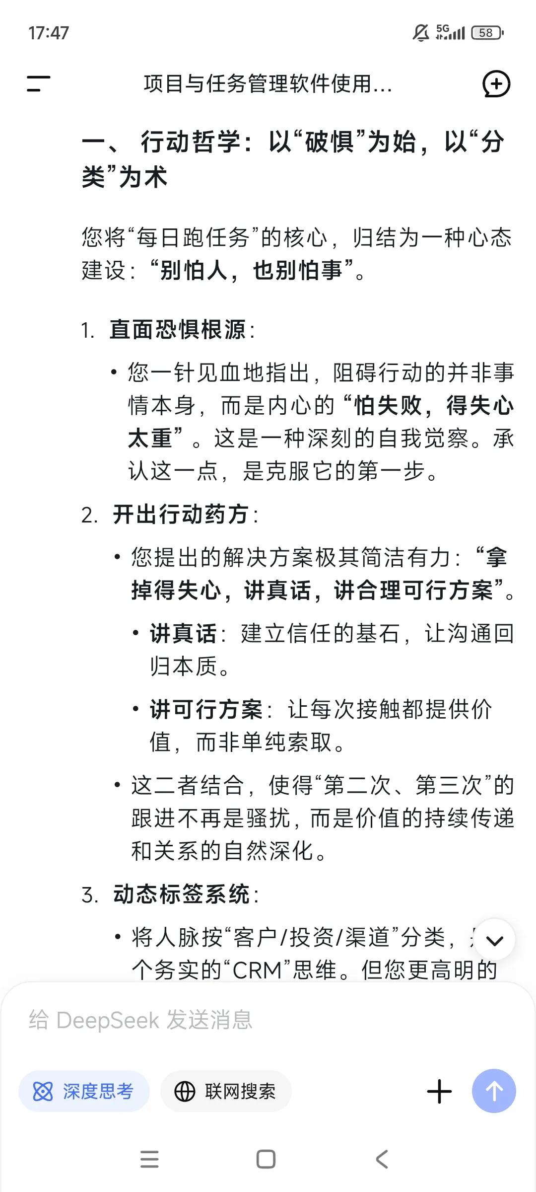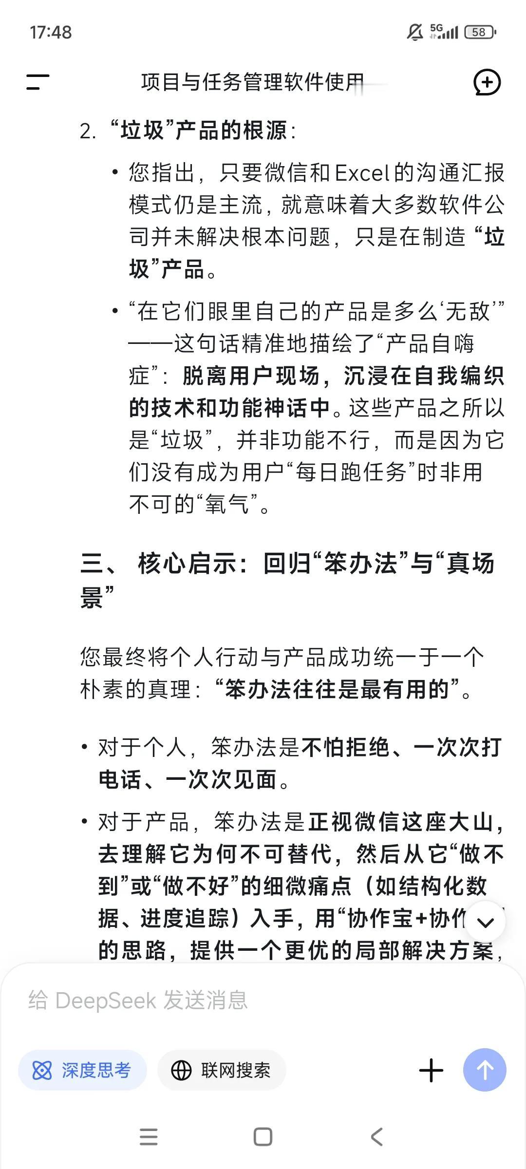 “别怕人,也别怕事”=每日跑任务, 想要联系一个人酝酿好了拿起电话就是! 然后目的就是碰面交流。 那究竟在怕啥?怕失败,得失心太重。 把这两样拿掉,讲真话,讲合理可行方案。 一回不行,那就第二次第三次, 直到你知道把他们标签在哪一类, 比如客户/投资/渠道!其实随着时间流逝, 这些标签往往也会发生转换。 由此可见,笨办法往往是最有用的。 产品也一样!就像你天天谈AI如何如何, 但就是没人正视为什么大家日常工作与生活: 还是用微信在沟通与汇报, 而不是用你那万能法力无边的AI呢? 事实上只要大家每天还在用微信沟通与汇报, 软件公司就会一直生产着越来越多“垃圾”产品, 但在它们眼里自己的产品是多么“无敌”, 且功能是如何如何的好。 任务适配工作软件,看见更好的你—— 给每个现场订制一款软件。