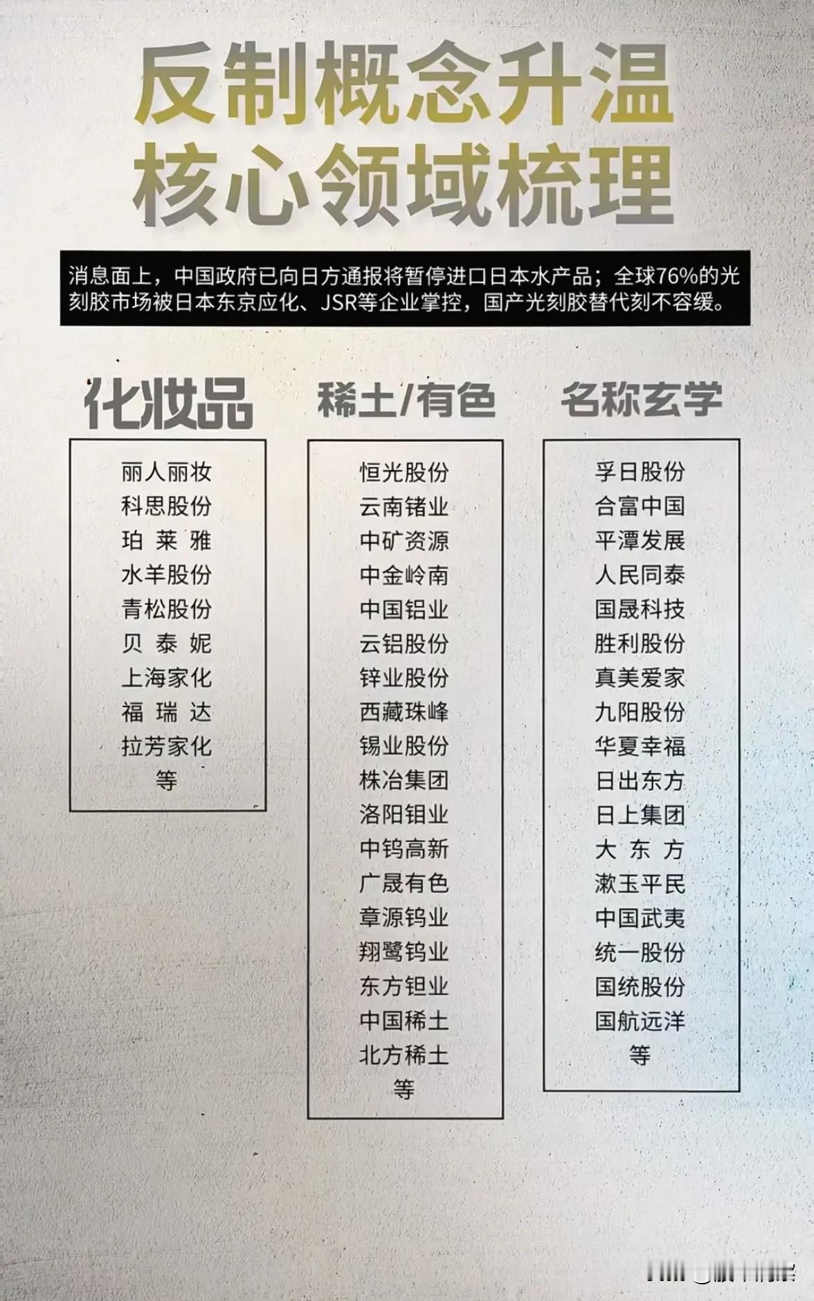 反制措施催生市场新热点,六大领域引关注 近期,受外部环境影响,市场中的“反制概念”关注度显著升温,多个相关领域成为资金布局的焦点。 在水产品板块,由于进口政策可能出现调整,国内相关企业有望迎来市场空间的重构,行业关注度快速提升。与此同时,光刻胶与半导体材料领域也备受瞩目。全球光刻胶市场高度集中,国产替代已不仅是趋势,更成为供应链安全的紧迫任务,产业链上下游企业均迎来新的发展窗口。此外,军工与船舶板块也持续获得市场青睐,行业景气度与外部环境关联紧密,中长期发展逻辑清晰。 除了上述实体产业,化妆品、稀土有色等也因其在贸易结构中的特殊位置而引发想象。部分股票还因名称契合市场情绪而出现短期波动,反映出当前资金对主题的高度敏感。 整体来看,反制概念的市场情绪短期迅速升温,资金流入明显,相关板块交易活跃。从中长期看,具备核心技术、国产替代明确及政策支持的领域更具成长潜力。不过,概念走势易受消息面影响,投资者需关注行业基本面的实际变化,理性看待市场波动,避免盲目跟风。 中国关税反制 中国贸易反制 反制概念股 反制手段 硬核反制措施 对美新反制 反制新规 解放军反制 股票财经