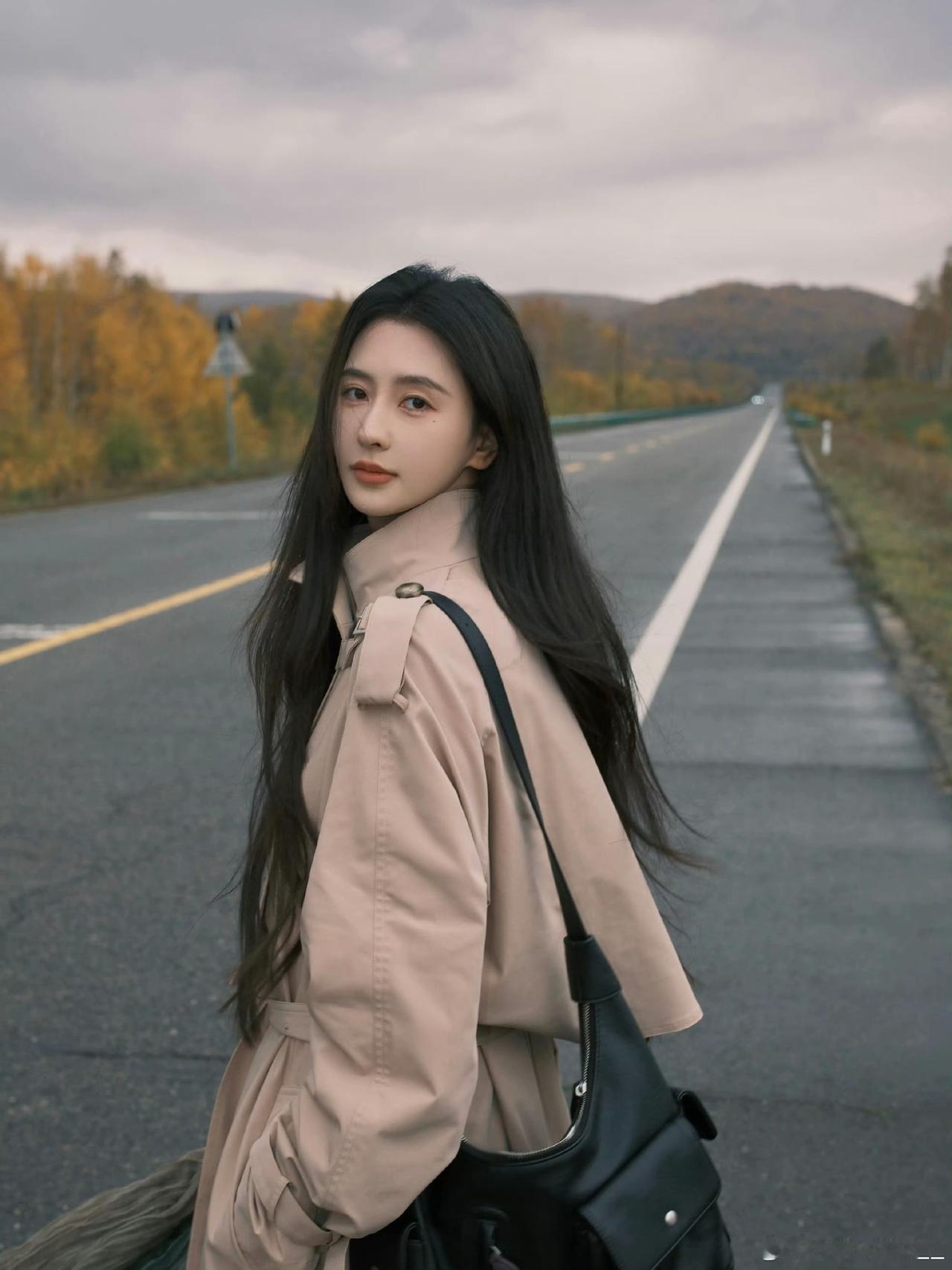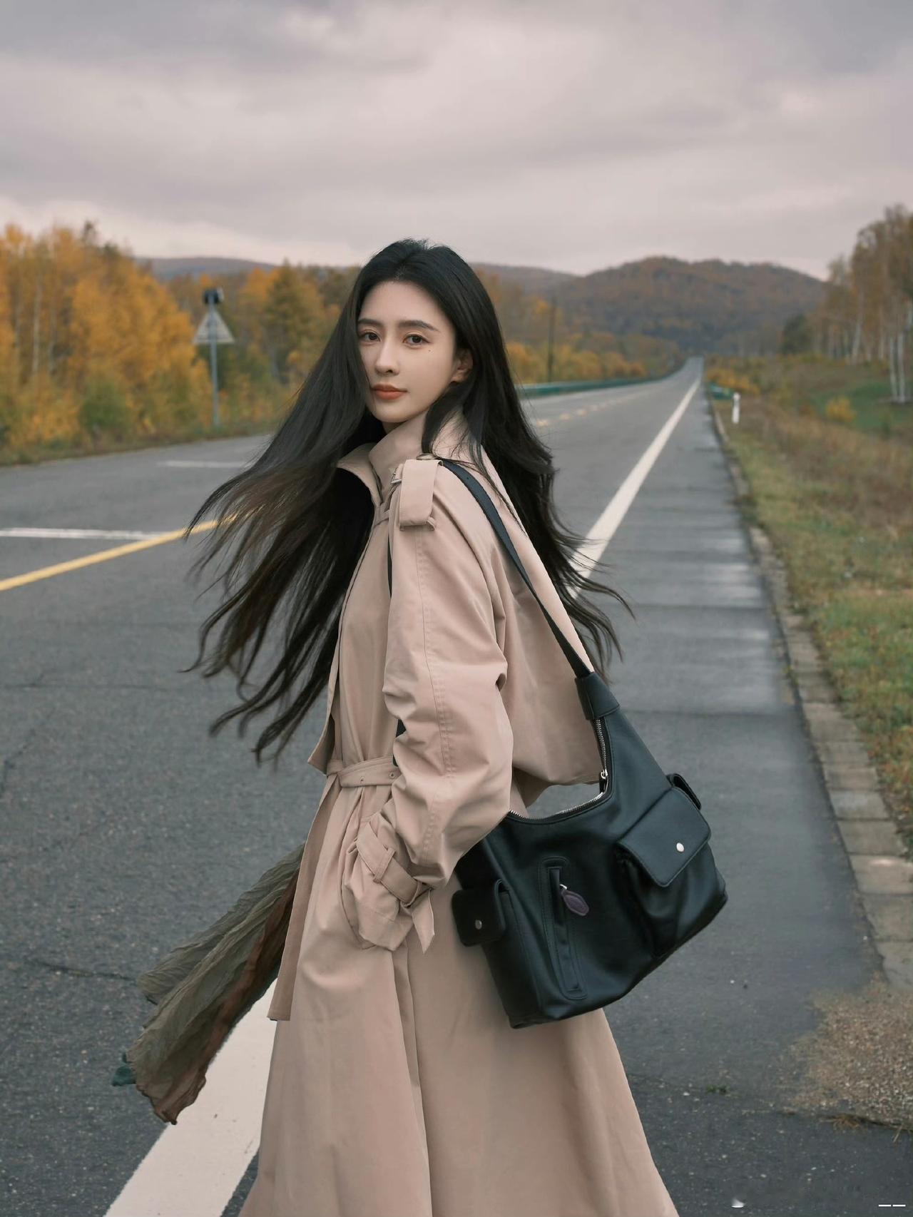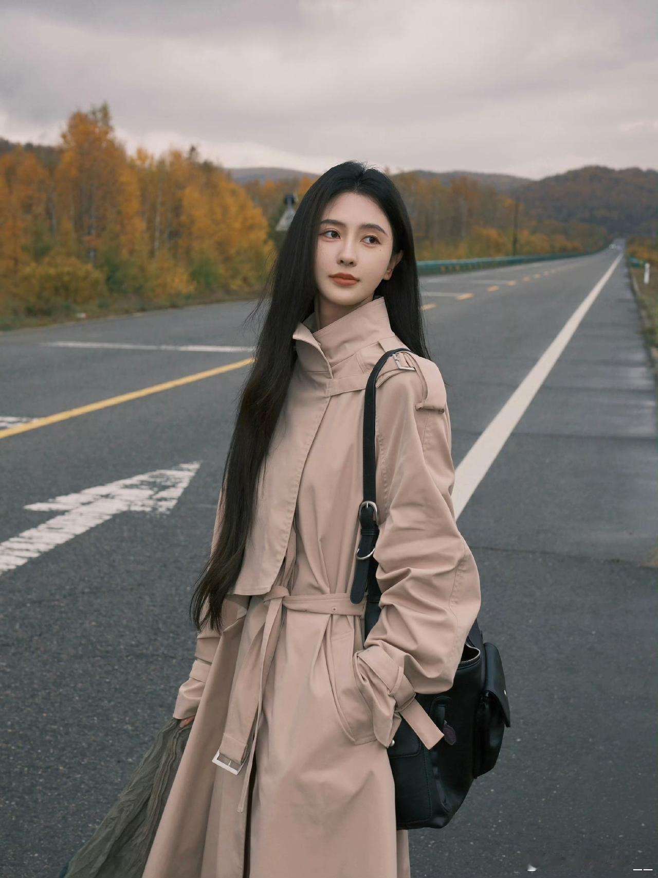 秋日漫步,长风衣与落叶相伴