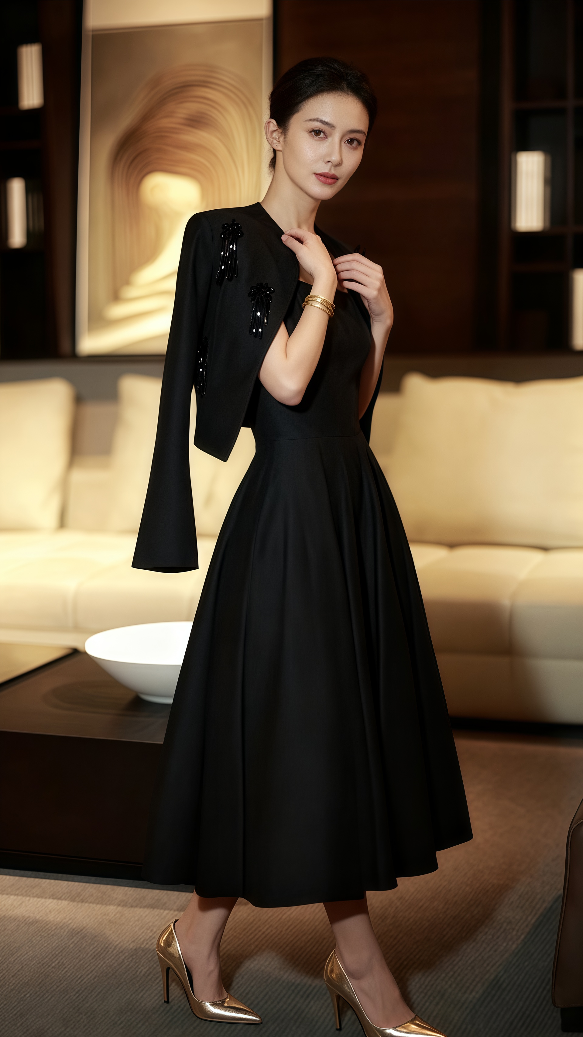 当她换上黑色礼服时,整个氛围变得更加庄重。她站在吧台旁,手轻轻搭在台面上,仿佛在等待着什么。金色的高跟鞋与黑色礼服形成鲜明对比,更加凸显了她的气质。