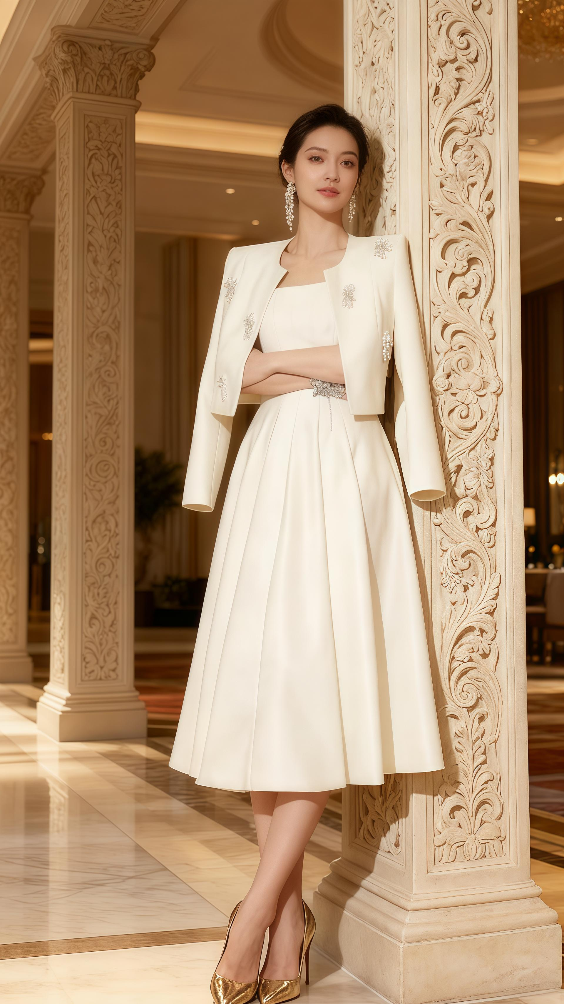 换个角度,她站在装饰华丽的柱子旁,双臂交叉,展现出另一种风格。背景的雕刻和灯光为她增添了几分神秘与高贵。