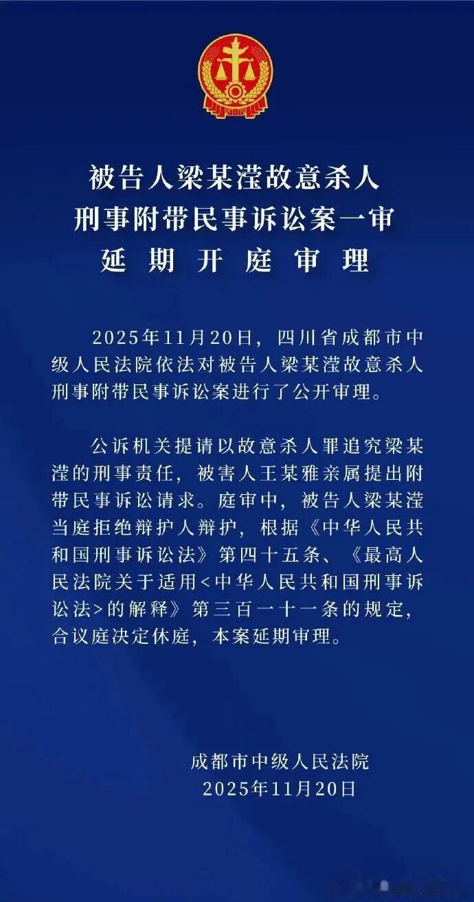 11月20日晚,成都市中级人民法院通报称,当天依法对被告人梁某某故意杀人刑事附带民事诉讼案进行了公开审理。公诉机关提请以故意杀人罪追究梁某某的刑事责任,被害人王某雅亲属提出附带民事诉讼请求。庭审中,被告人梁某某当庭拒绝辩护人辩护,合议庭决定休庭,本案延期审理。