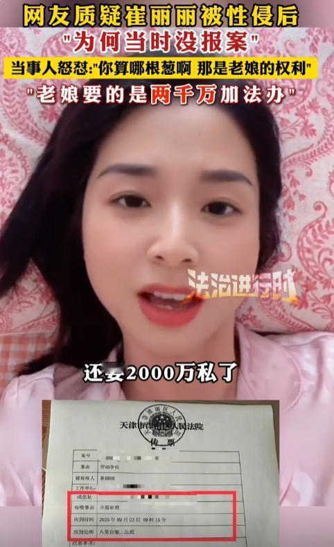 崔丽丽人设崩塌!怒怼网友算哪根葱,自曝真实目的,2000万都不够。 崔丽丽这个名字最近又上了热搜。事情得从两年前说起,当时她跟着老板王某去杭州谈生意。结果那晚喝了酒,第二天醒来发现自己跟王某在一个房间。十天后崔丽丽调了酒店监控,发现当晚王某把她抱进了房间,就报了警。案子到了今年4月判了,王某被判强奸罪四年。可事情还没完,崔丽丽又申请工伤赔偿,说那次受伤该算工伤。 天津那边去年12月认定了她是工伤,公司不服一直告。到今年7月法院一审才最终定下来,公司得赔。原本这事大家都挺同情她的,毕竟工作被人侵犯挺惨的。但后来网上开始有人翻细节,问题越来越多。 有人问为啥隔了十天才报警,崔丽丽解释说是害怕丢工作,还有心理创伤不敢马上处理。可监控显示那晚她搂着王某脖子,看起来挺清醒的,这让人质疑她喝没喝醉。还有人注意到她私下跟王某谈过赔偿,开口要两千万,后来降到两百万都没成才去报警。 最让人气愤的是崔丽丽社交账号发的一段视频。里面她骂网友“算哪根葱”,还说“我要的是两千万加法办”,语气特别难听,完全不像之前媒体采访里那个受害者样子。她还特意标注视频是虚构娱乐,后来承认说自己真发过。 现在评论区一片骂声,说她炒作蹭热度,故意搞这么大为了捞钱。确实她账号一直活跃,经常直播说案子进展。有人觉得她本来是受害人,结果把自己搞成现在这样太可惜了。 事情到这一步,支持她的人越来越少了。法院判了王某有罪是事实,但崔丽丽后来一系列操作把大家对她的同情都打没了。很多网友评论说网络真是把双刃剑,既能帮人也能毁人,这话真不假。