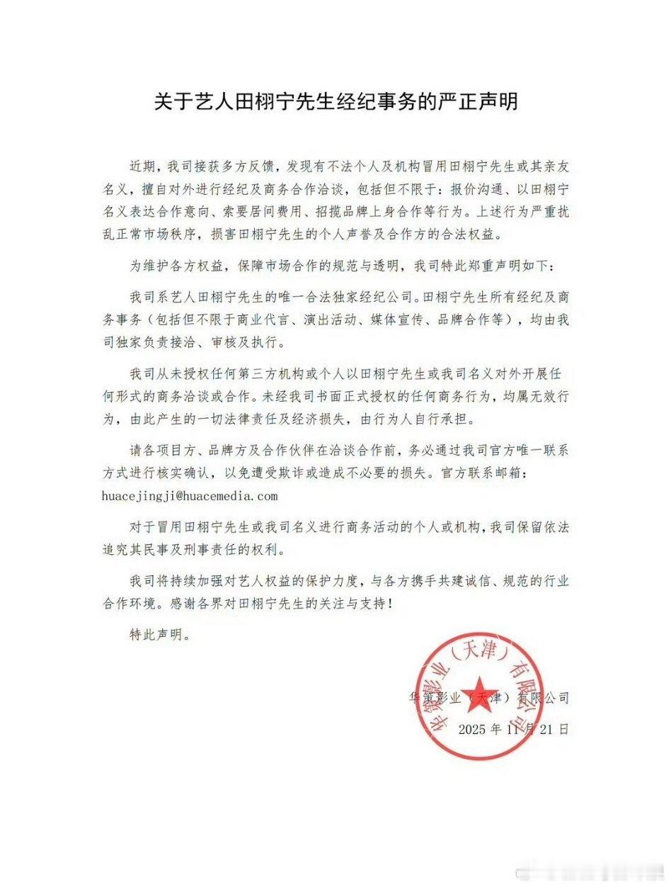 华策声明:有人以田栩宁名义擅自对外进行经纪和合作洽谈,华策和田栩宁将进行维权。