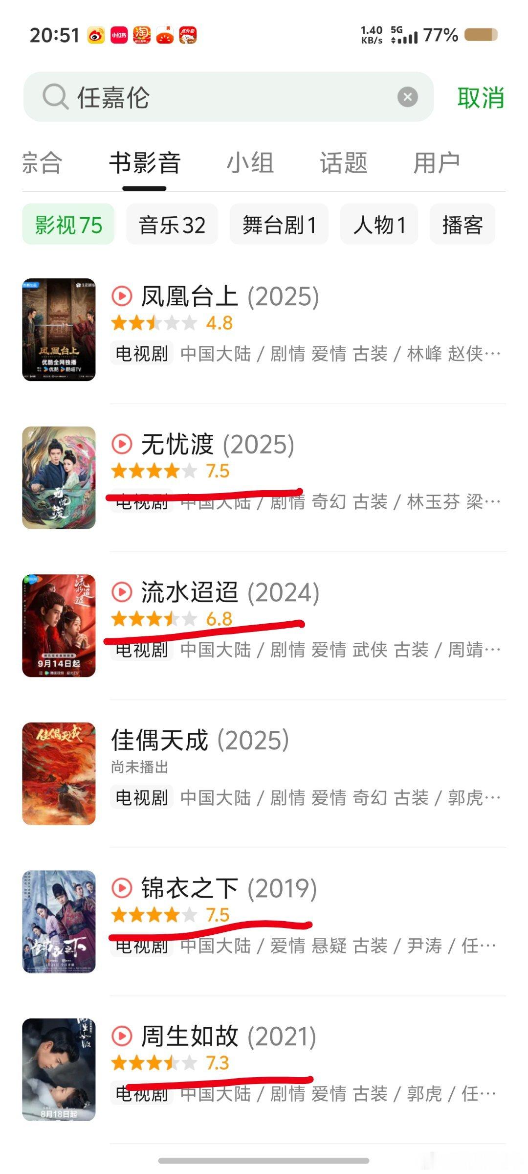 打开豆瓣搜索任嘉伦,第一页随便一截~远了不说同年播出的无忧渡7.5,撇开黑团建,