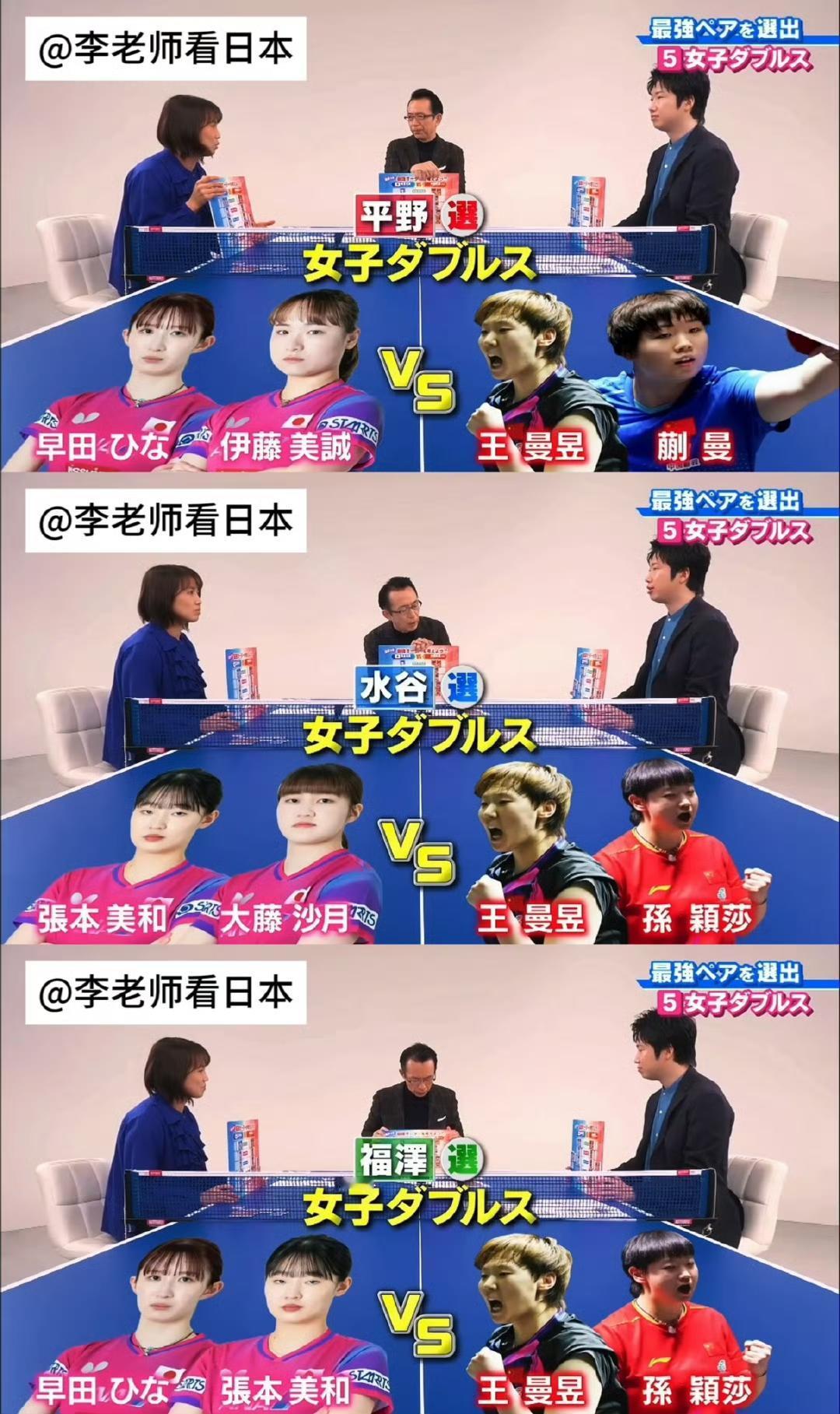 日本媒体又整活了!针对今年成都混合团体世界杯对中国队排阵布局,特别制作了一期电视节目。 关键是,节目中的乒乓球专业嘉宾都在讨论排兵布阵时,全部针对王曼昱做布局! 女单中,无论日本派出大藤沙月、早田希娜还是伊藤美诚都是对阵王曼昱。 女双中,日本两对组合早田希娜/伊藤美诚和张本美和/大藤沙月,还是对阵王曼昱参与组合,王曼昱配对孙颖莎或者蒯曼。 的确,王曼昱对日本战绩已经累积6年不输单打。 前两届的混合团体世界杯决赛阶段也都是王曼昱连续上场,发挥出色战胜日本队,助力国乒最后取得冠军! 可是,日本人眼里难道中国女乒就约等于王曼昱一个人了吗? 只能说,日本人认为只有突破王曼昱才可能战胜国乒! 王曼昱是守护国乒冠军和尊严的绝对利刃!