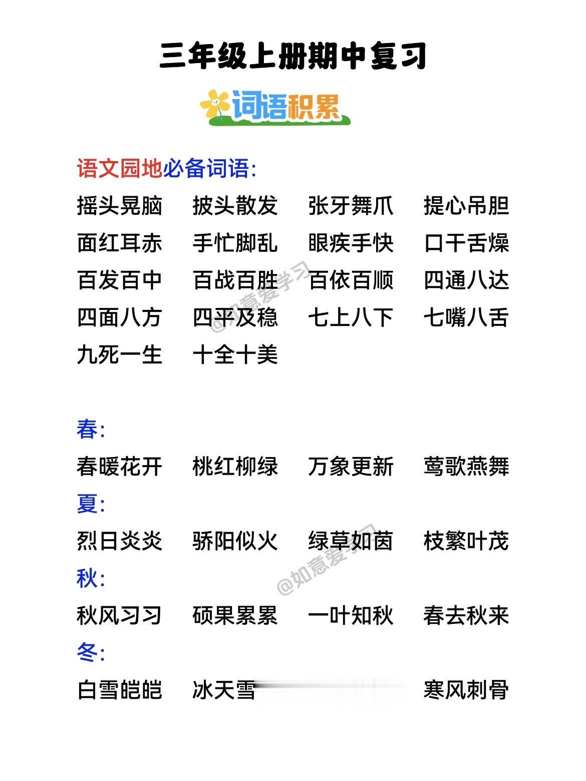 还有两天闺女就期中考试了,整理的《词语积累》复习用。还没有期中考的也截图背一背吧!
