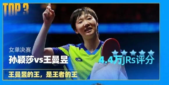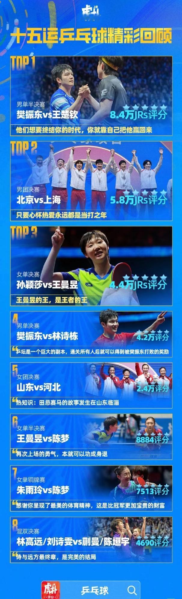 虎扑评选十五运乒乓球精彩回顾! 樊振东VS王楚钦,男单半决赛之战评分位列第一。 王曼昱VS孙颖莎,女单决赛之战位列评分榜第三。 男团决赛位列评分榜第二。 看得出来,虎扑用户都是喜欢国乒顶尖队员之间的强强对决! 精彩刺激,让人目不暇接!