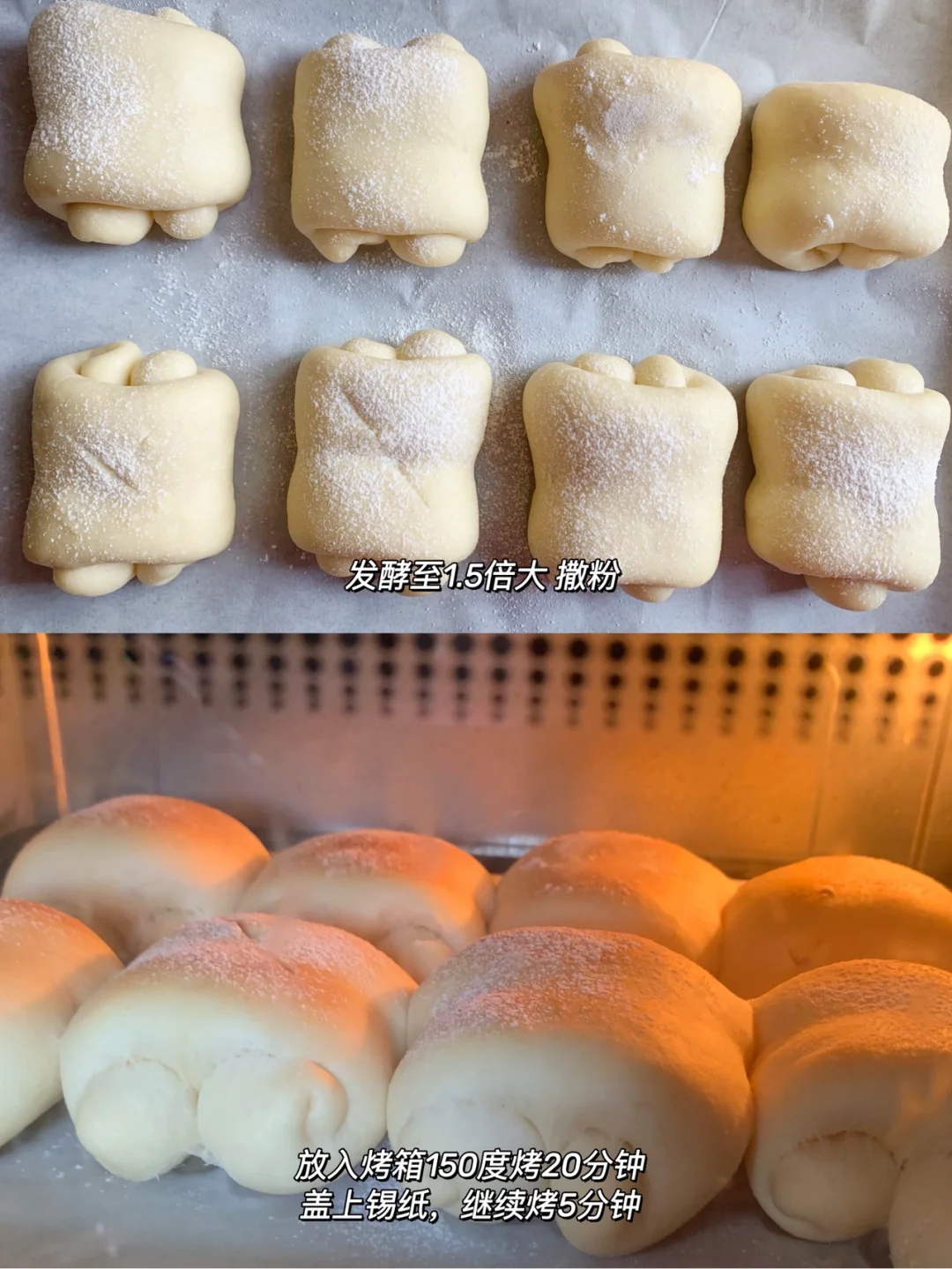 3⃣️发酵好拿出表面筛一层面粉装饰,烤箱预热,上下火150度烤25分钟(注意看表面上色后盖上锡纸,避免上的太深)