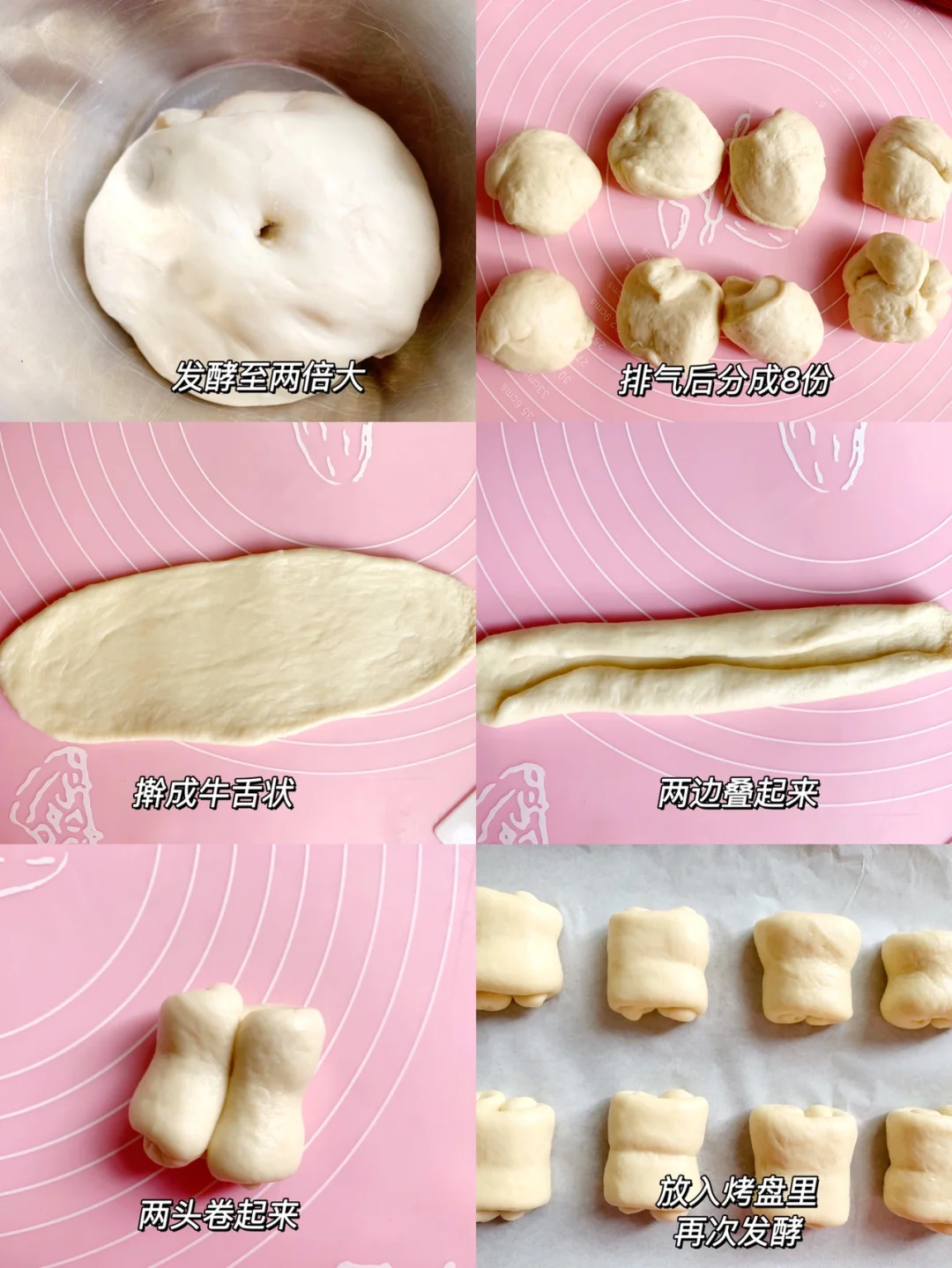 2⃣️揉好后盖上保鲜膜,在厨师机里发酵至两倍大,揉搓排气,分成8个小剂子,擀成牛舌状,两边重叠卷起,放入烤箱