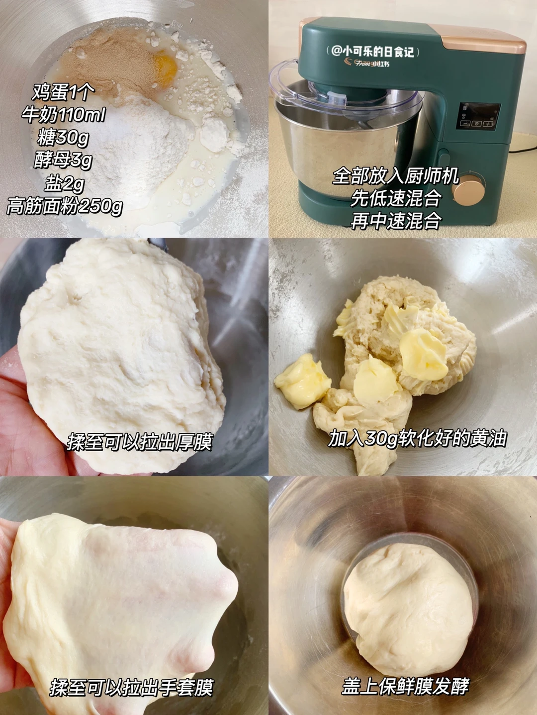 1⃣️将除了黄油外的所有食材放入厨师机中,先低俗混合,再转中速,揉至可以拉出厚膜,加入酱油继续揉面,揉出手套膜