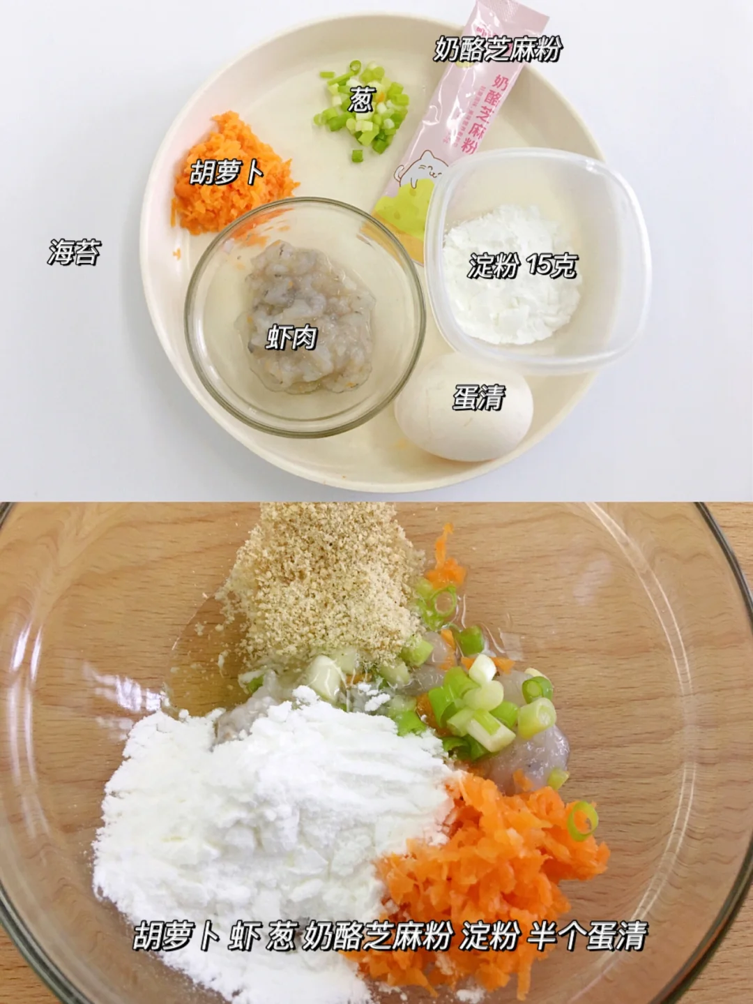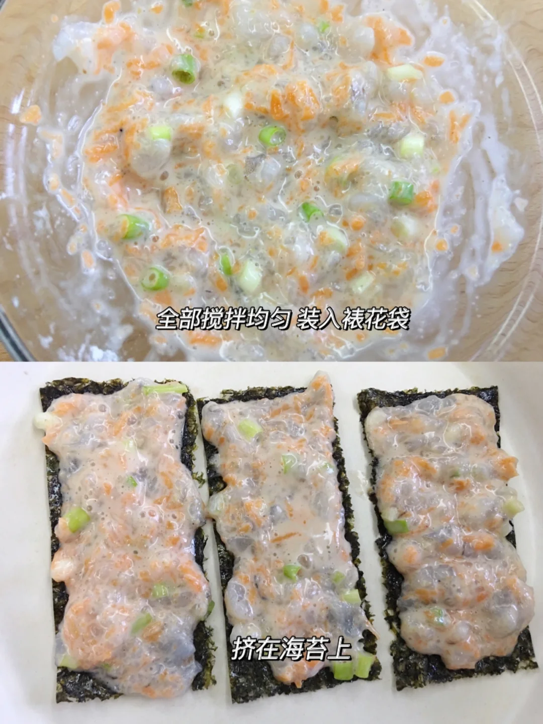 网友们真的太会做了👍🏻海苔虾滑饼太好吃了,做了宝宝版的,不需要加调料也很好吃,虾和海苔就很鲜了,可以当作手指食物锻炼抓握