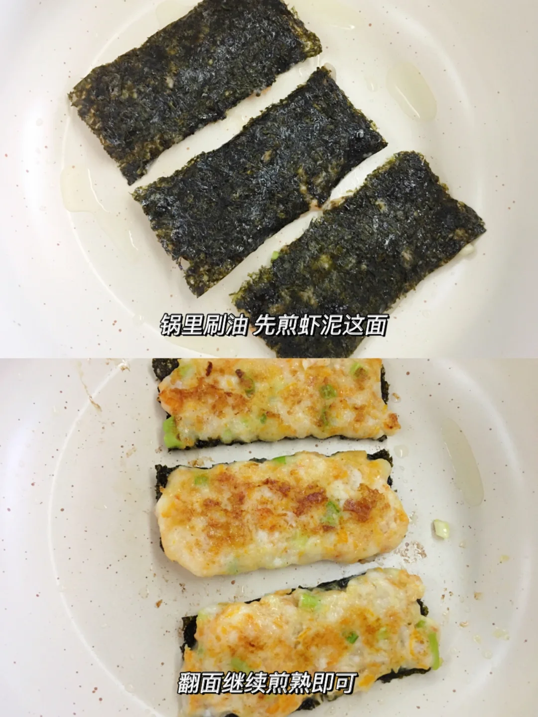 3⃣️锅里刷油 虾泥这面先煎 定型后翻面继续煎至熟(全程小火慢煎)