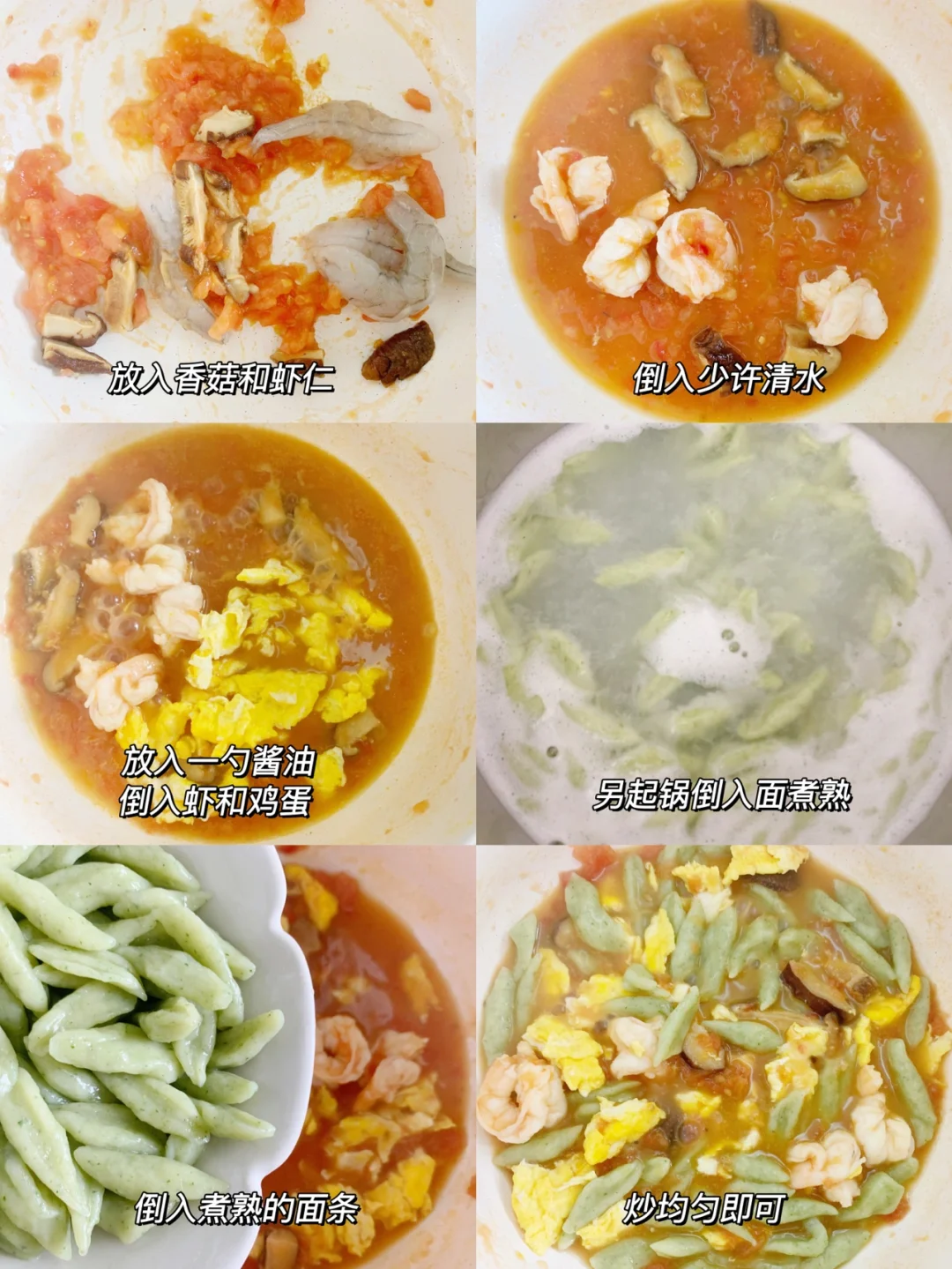 3⃣️倒入番茄炒出汁,再放入虾仁和香菇炒香,加入少许清水,一勺酱油和鸡蛋煮开,再倒入面条翻炒均匀