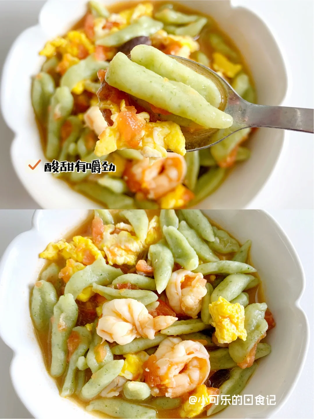 [偷笑R]上次的山药剪刀面,可乐超爱吃,今天又做了开胃的蔬菜剪刀面,面条爽滑劲道,加了蔬菜汁,专注不爱吃菜的宝宝,酸甜开胃。[赞R]做法也简单,不用揉面擀面,用剪刀剪一剪就可以
