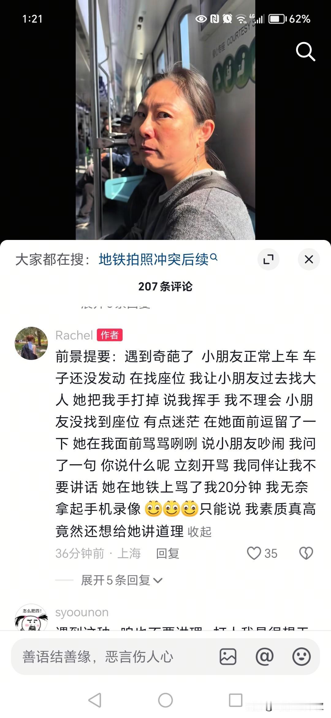 今天继续聊聊上海地铁车厢里的各种乱像。最近有网友爆出她带着孩子乘地铁时遭到一堆对外地中年女子的辱骂。事情是这样的,她带孩子进地铁车厢里后准备找座位,小朋友没找到然后在两个女子面前站了一下遭到他们的指责说小孩子太吵闹!于是孩子的母亲就和两个外地女子吵起来了,孩子母亲感觉吵不过她们俩就用手机视频录下来,结果出现了两个外地女子把孩子母亲反抽了一巴掌把她的手机打飞了。有网友说建议女子报警处理。