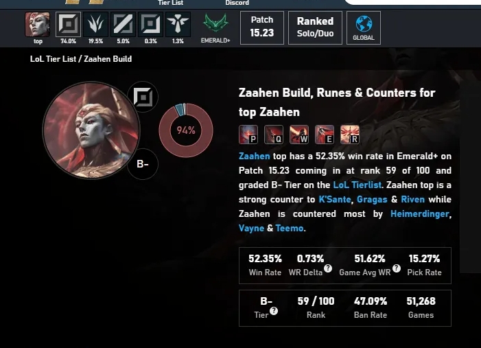 直播吧11月22日讯 根据数据统计网站lolalytics显示,新英雄亚恒上线后上单位置全分段胜率超50%,翡翠分段以上胜率突破52%。而随着分段越高亚恒的胜率也随之升高。