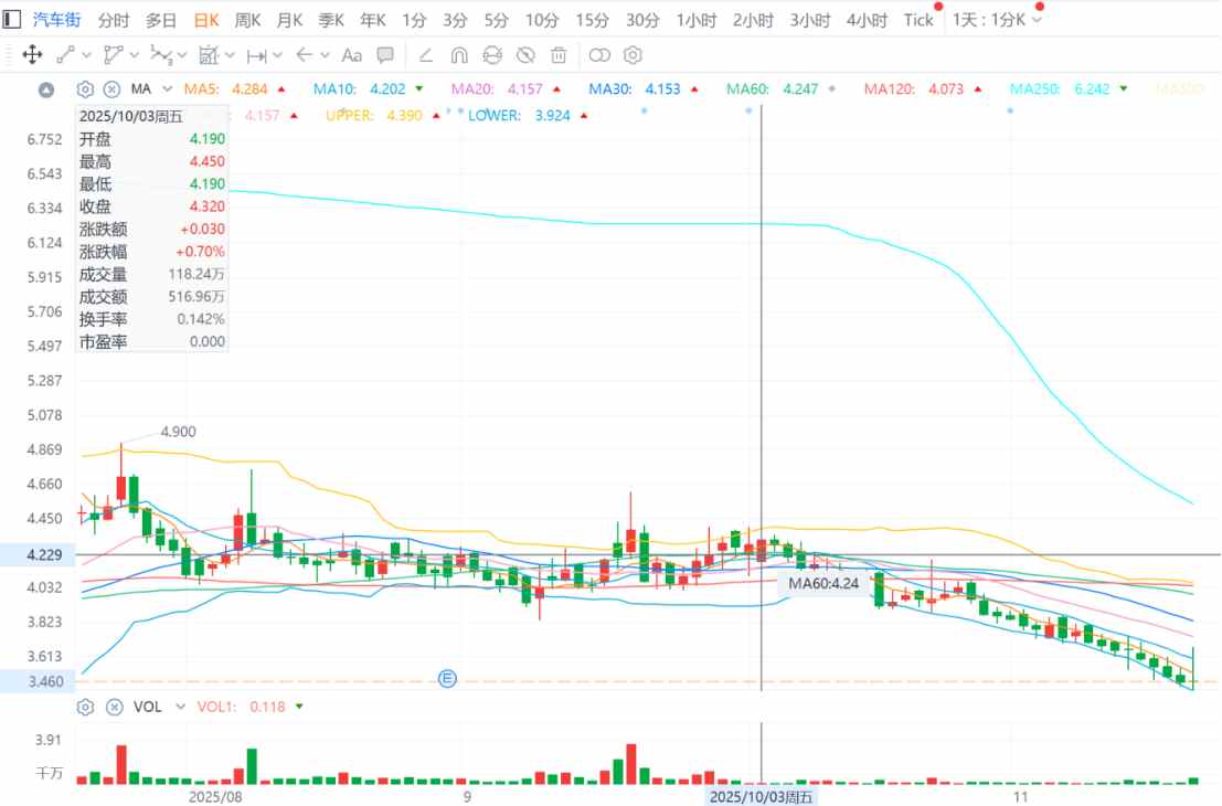 11月21日,汽车街(02443)盘中股价最低触及3.38港元,这预示着其在近期连续的下跌行情中,离刷新上市股价新低又近了一步。