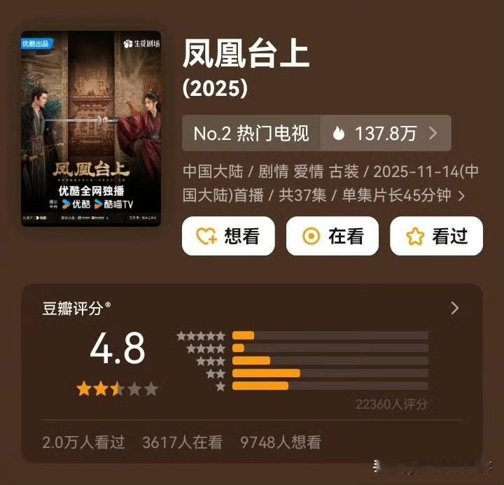《古装舒适区失灵?任彭新剧与“难兄难弟”共陷4.8分》 任嘉伦、彭小苒本是古装赛道的“熟手”,新剧《凤凰台上》却以4.8分收官,和《与晋长安》凑成“低分双生”。 观众本期待两人在舒适区里的默契,结果剧情老套、人设悬浮,让“古装适配度”成了空有其表的装饰。 曾经的古装王牌,如今栽在“套路化”里,这波口碑滑坡,也算给扎堆古装剧提了个醒。